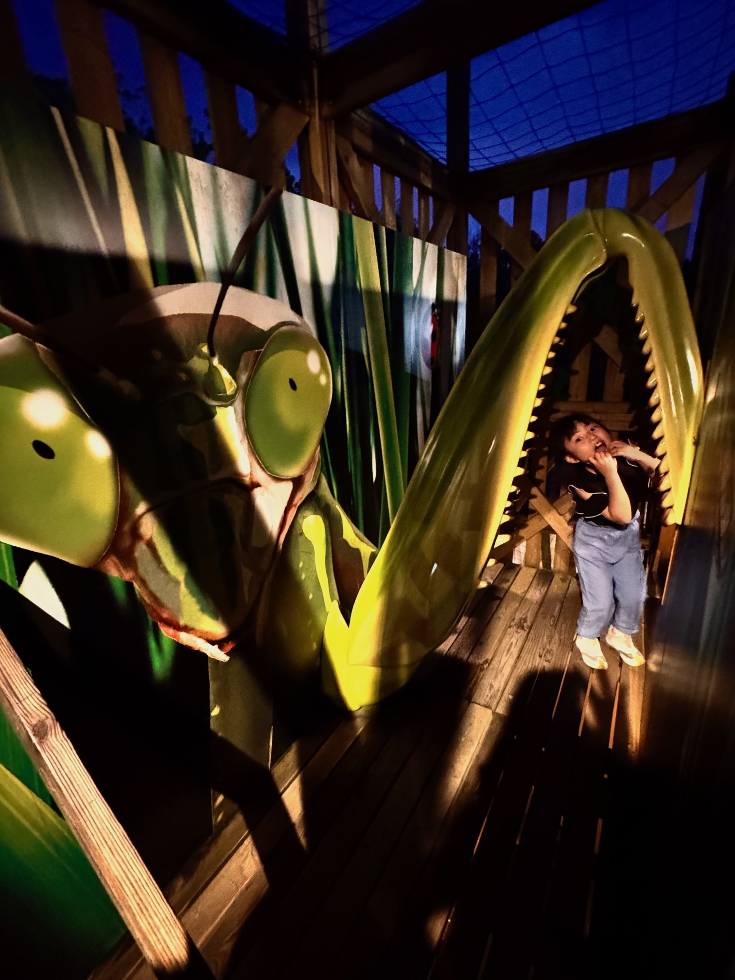 森の生態系を表現した立体迷路のアスレチック。リアルな生きもののオブジェを観察しながら、1階から5階までの14ヶ所のスタンプを集め、頂上を目指します。様々な障害物やバランスボール、ネット登りをしながら進む迷路は難しく、後戻りができないところもあって、家族で大苦戦しましたが、なんとかゴールにたどり着いた時は達成感でいっぱいでした。待ち時間は50分、所要時間は30分でした。