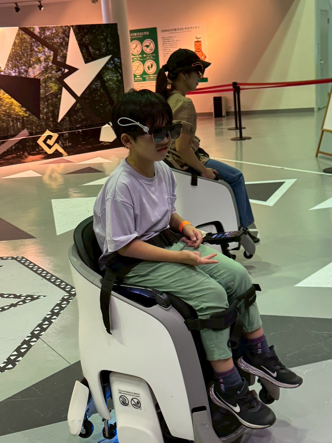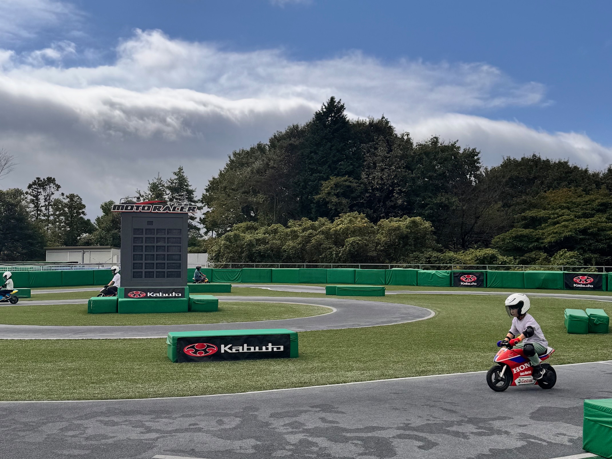 また、小学校3年生以上から体験できる「モトレーサー」はモビリティリゾートもてぎならではの本格的バイクアトラクション。リアルなバイクを乗りこなし、タイムアタックに挑戦していました。(待ち時間30分、所要時間15分でした。)