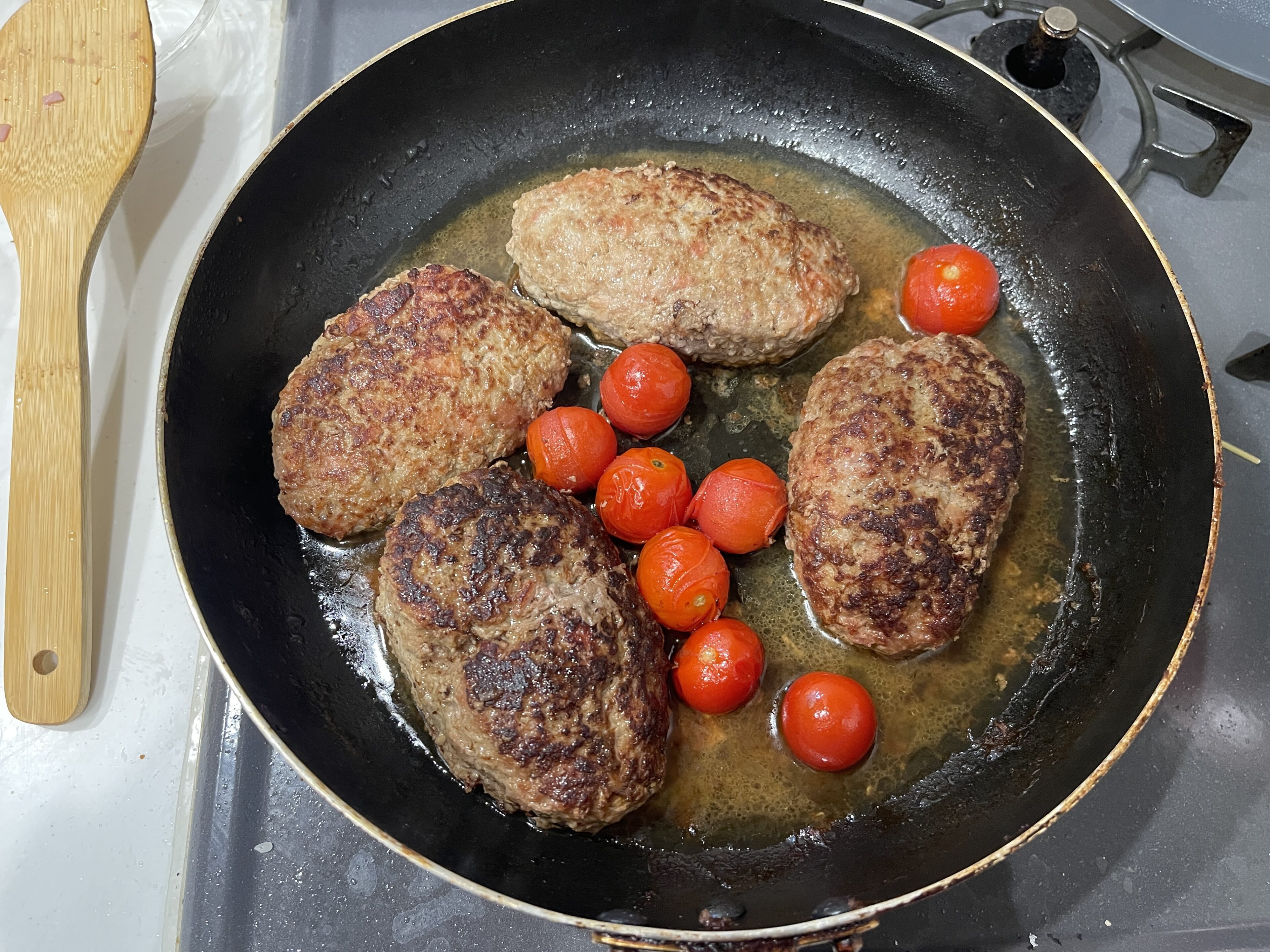 ミニトマトも良いですが、肉汁とバターで焼いたズッキーニやナスを一緒に焼くのもおすすめです。