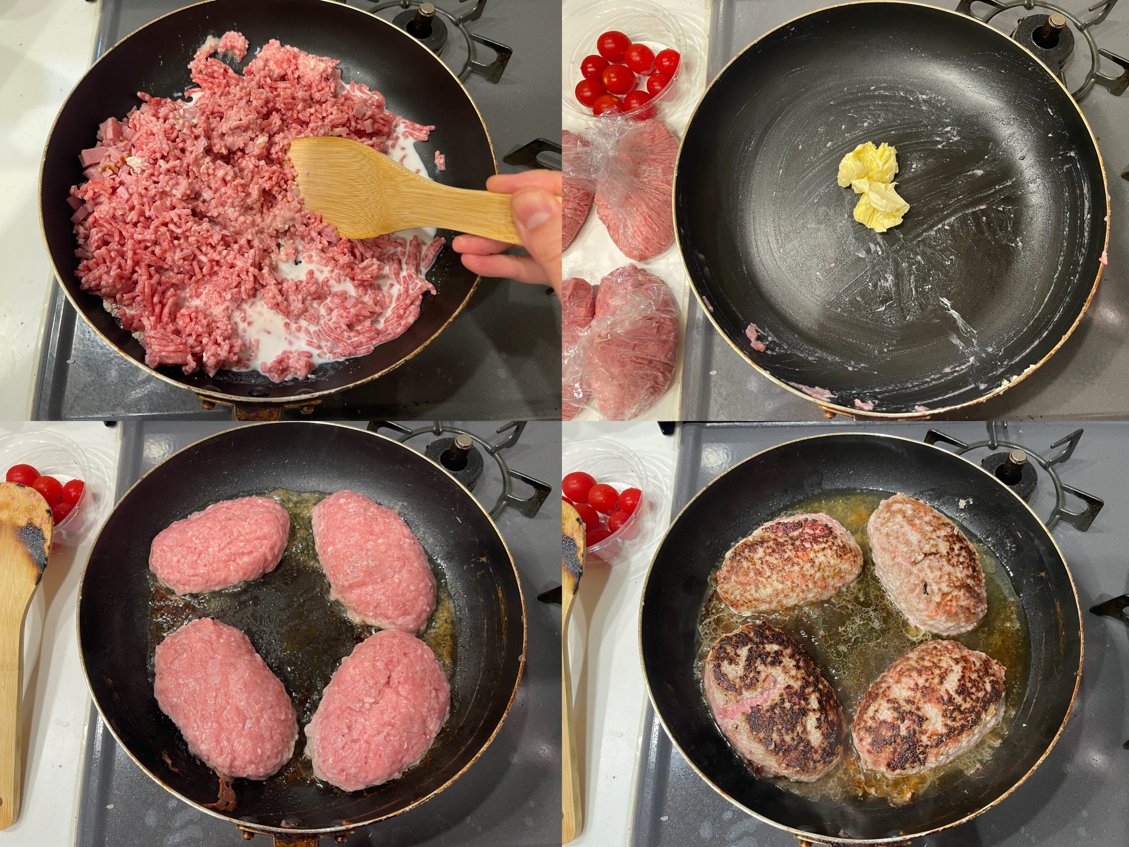 (4)ハンバーグをフライパンに乗せ、まず片面を中火で3分焼く。