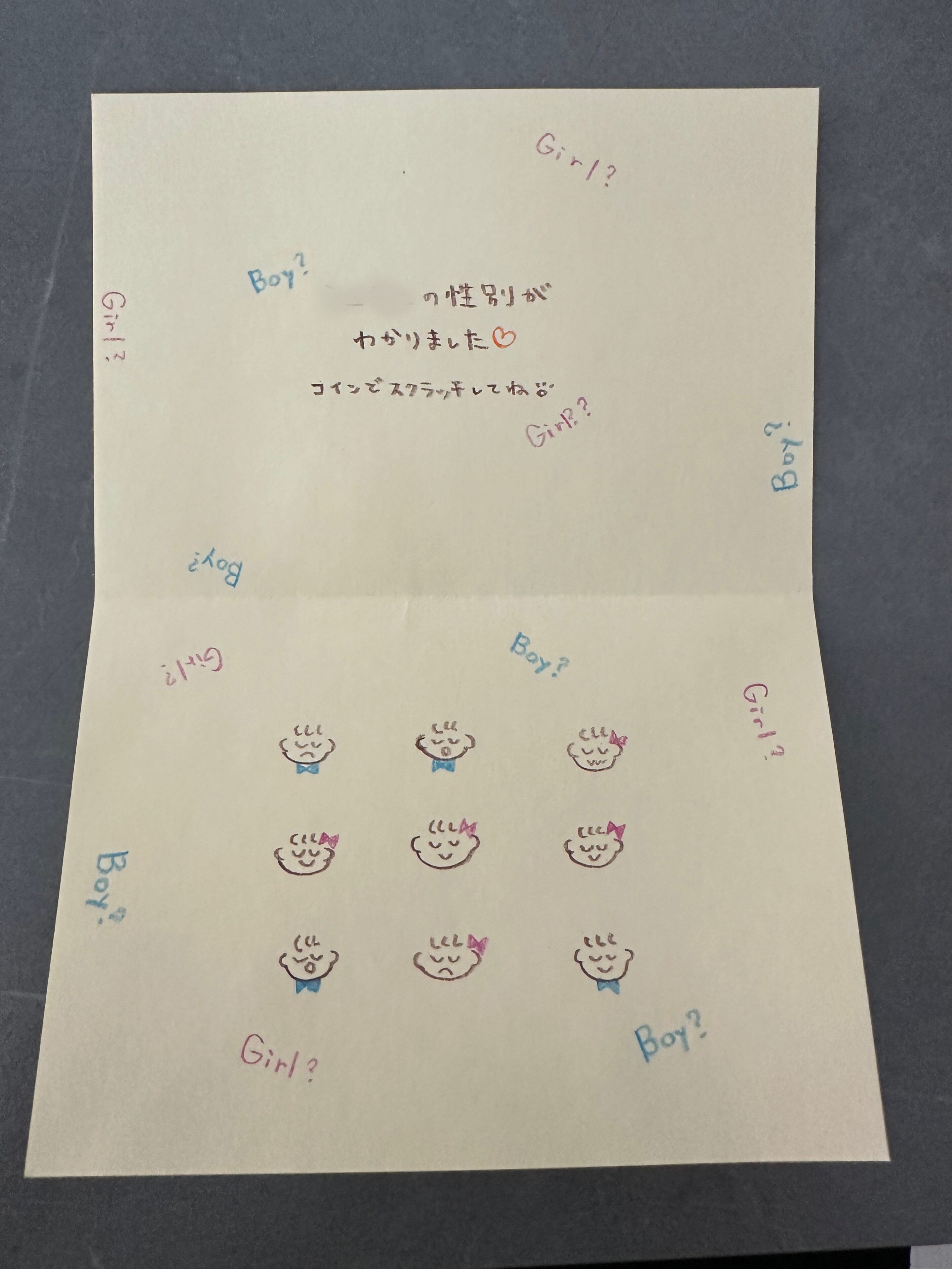 そもそもジェンダーリビールカードとは、スクラッチをしてそこに性別が書いてあるという仕組み。