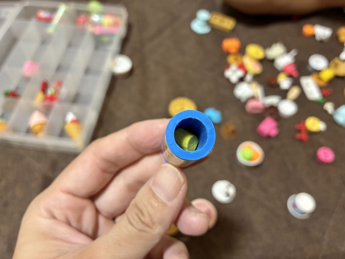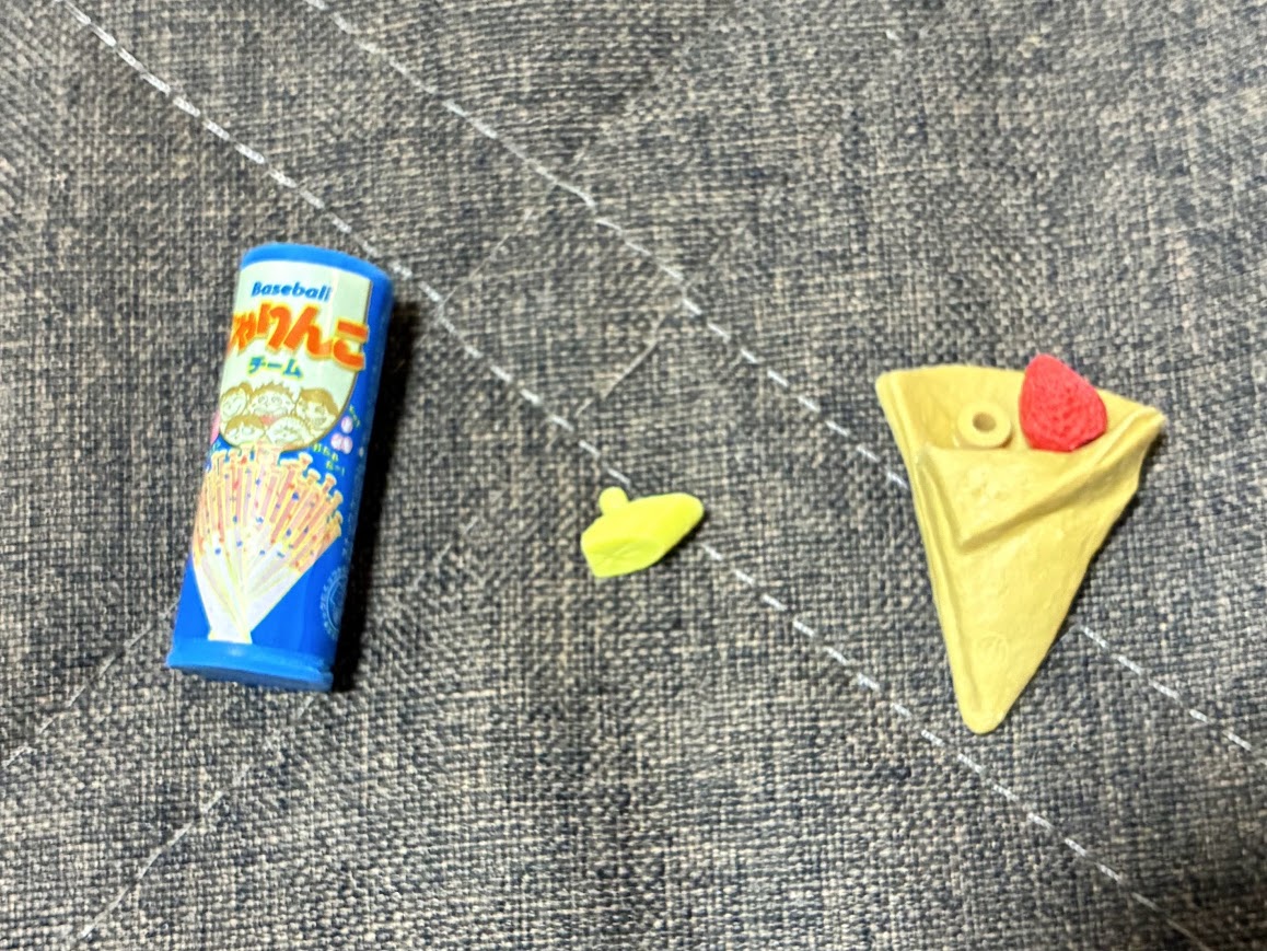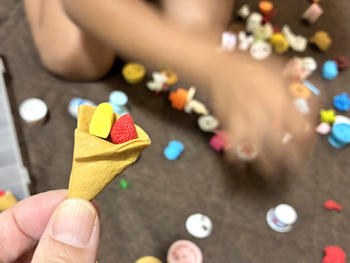 遊んでいたソファの周りをいくら探しても見つからず、仕方なくこのクレープ消しゴムごと見えないところに保管しておくことに。