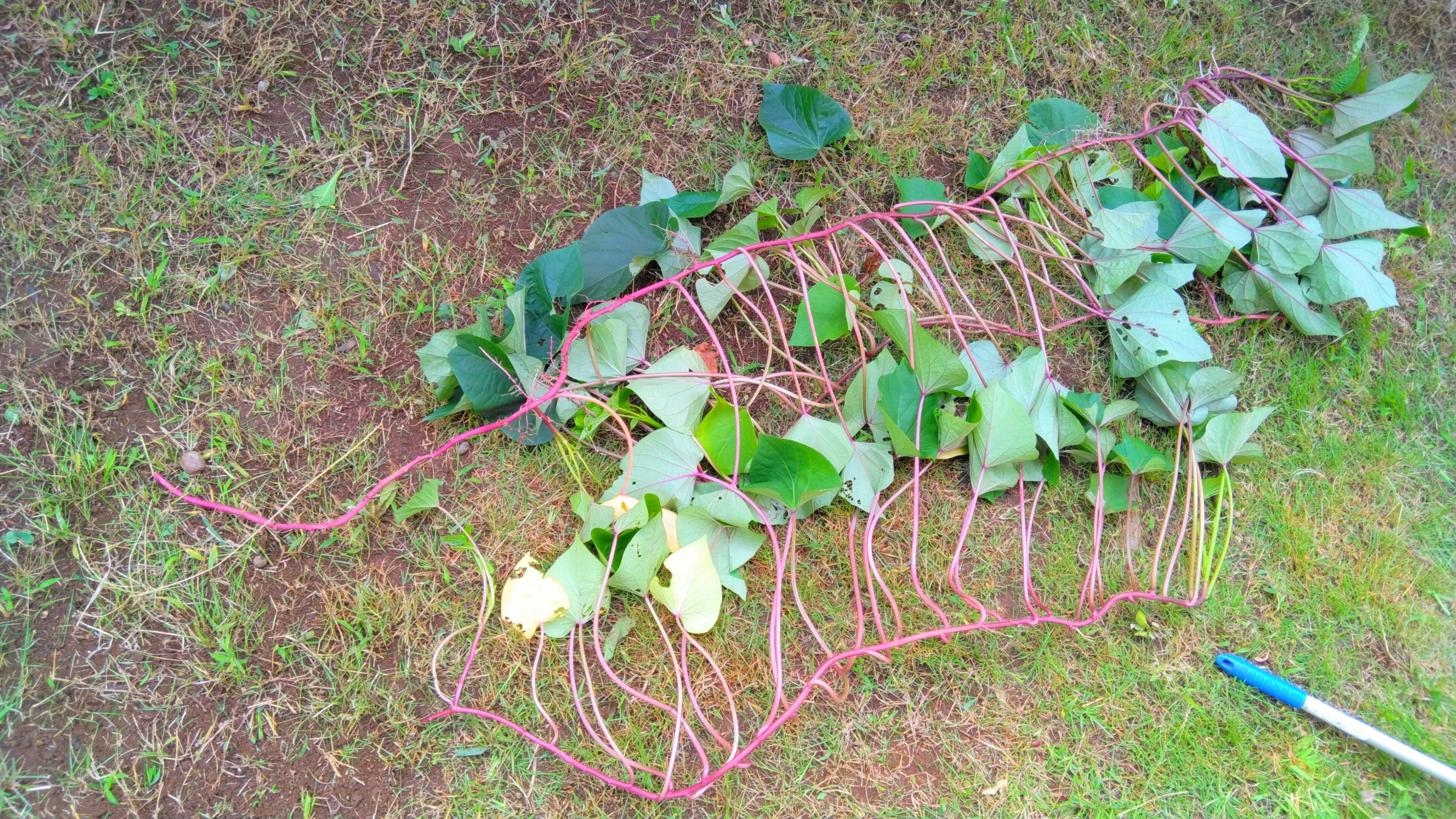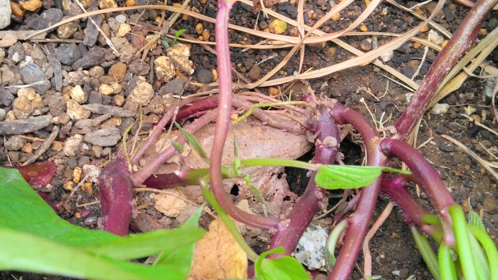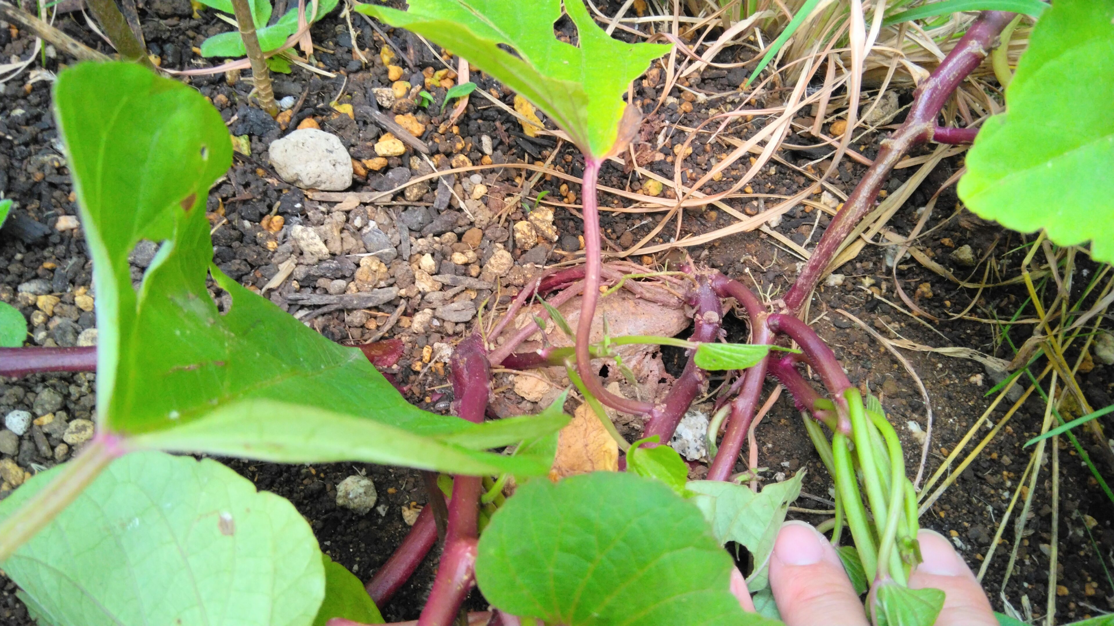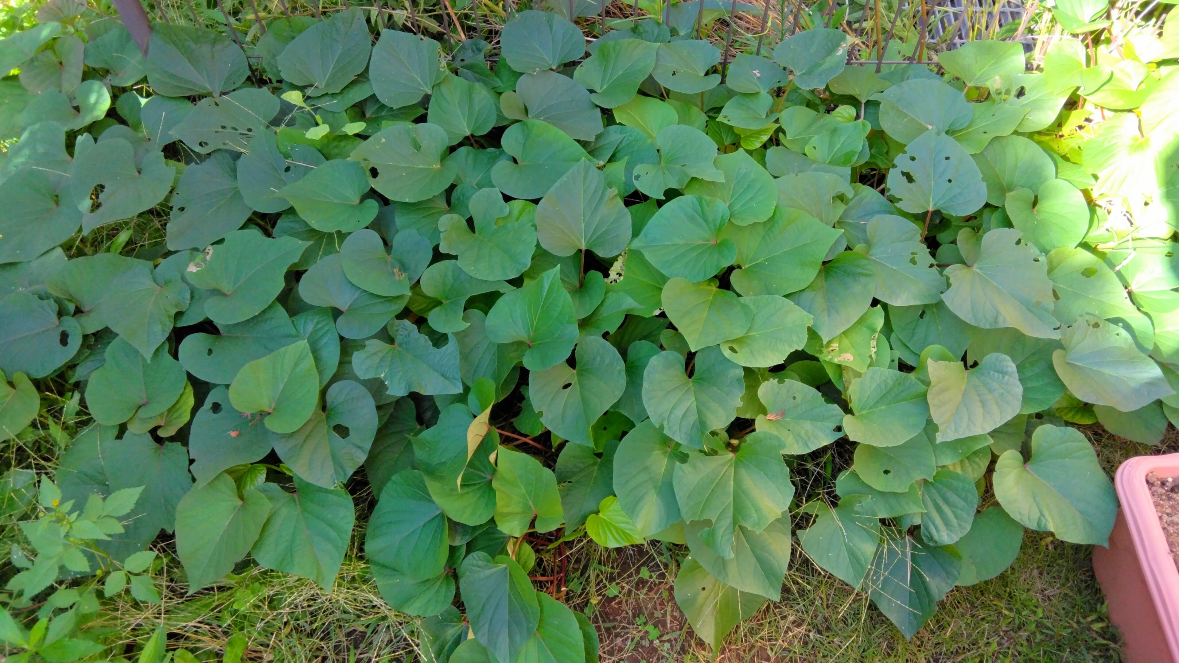 夏頃、芽が出たサツマイモをそのまま水につけていたらぐんぐん伸びたので、土に植えました。酷暑の日々、雑草の王国と化した庭を見て見ぬふりをして、季節は秋に。ふと目をやると、見慣れぬ葉の大群が…。