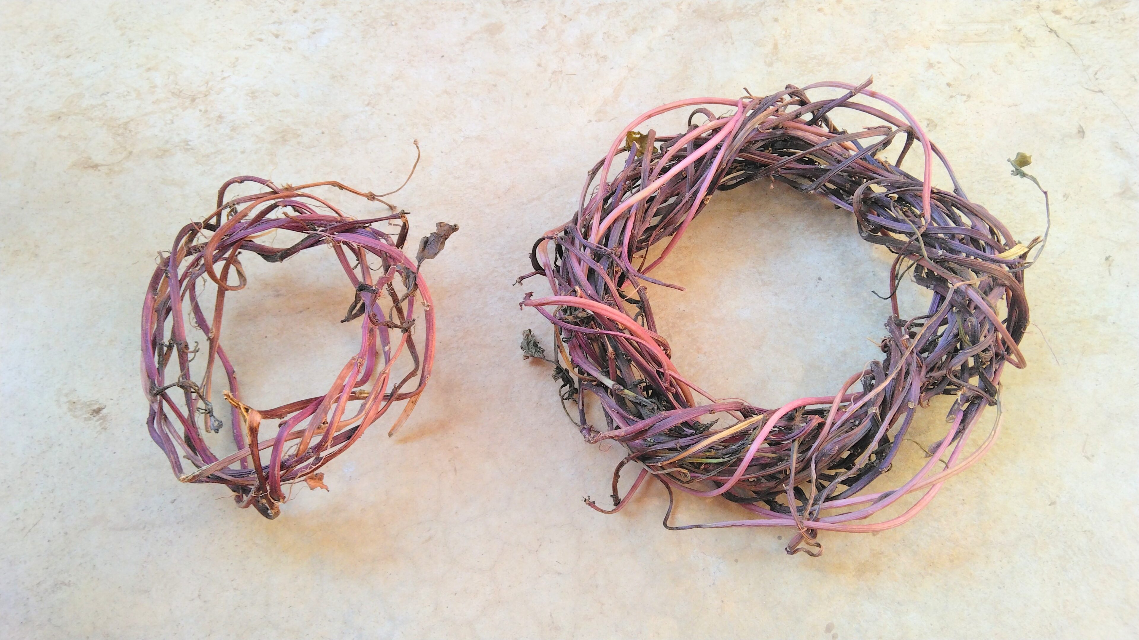 数年前にイベントで作った芋づるリースの写真を振り返ると、我が芋づるは細身。畑で立派に育つお芋とはきっと比較にならないと思いますが、庭でできる分には十分過ぎる成果でした。