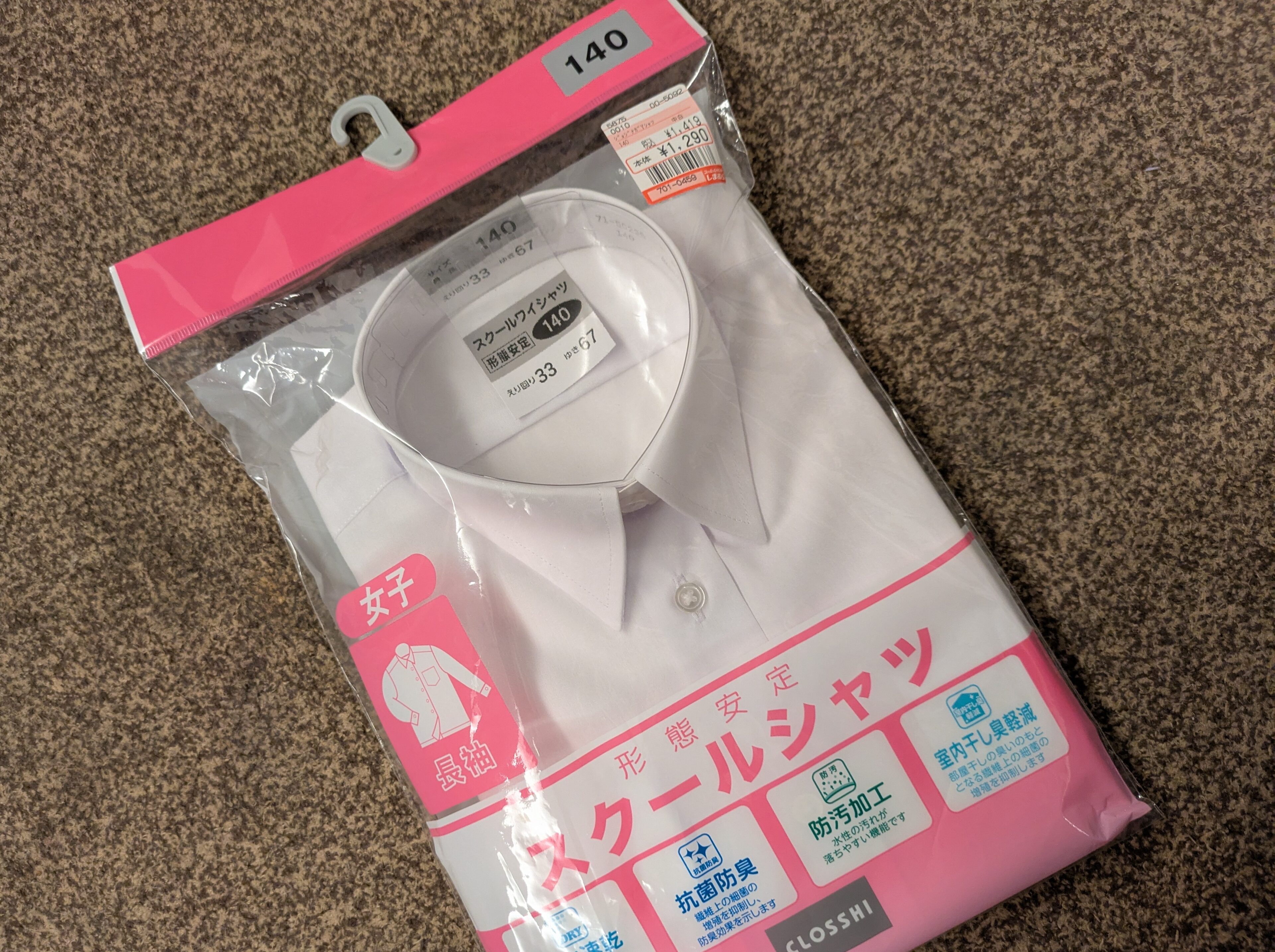 無事に白いワイシャツを入手しました!そして、ワイシャツに男の子用と女の子用があることも、40代になって初めて知りました。これも勉強です。