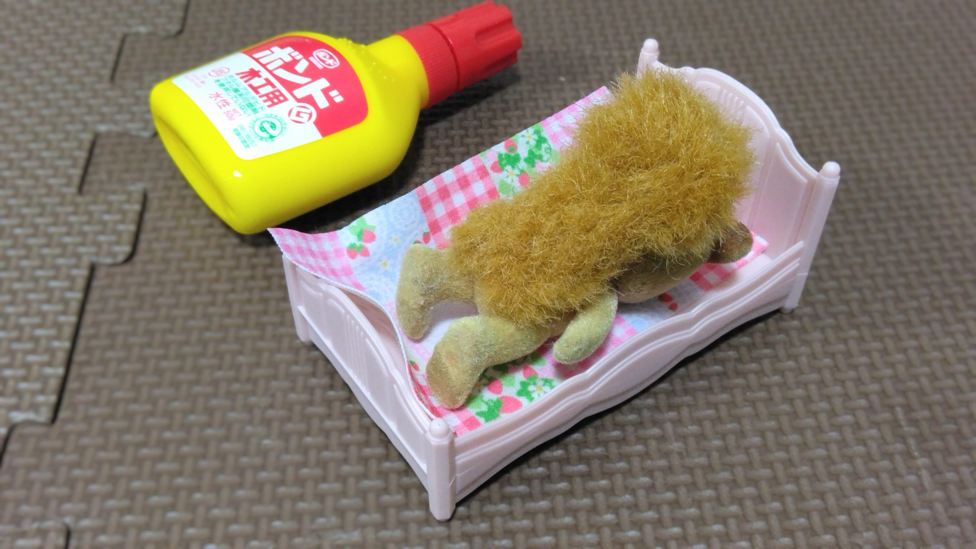 いかにもお尻に見えるのですが、プラスチックなので、この隙間に尻尾を挟むのは至難の業でした。結局戻せなかったので、木工用ボンドで応急手当を施しました。