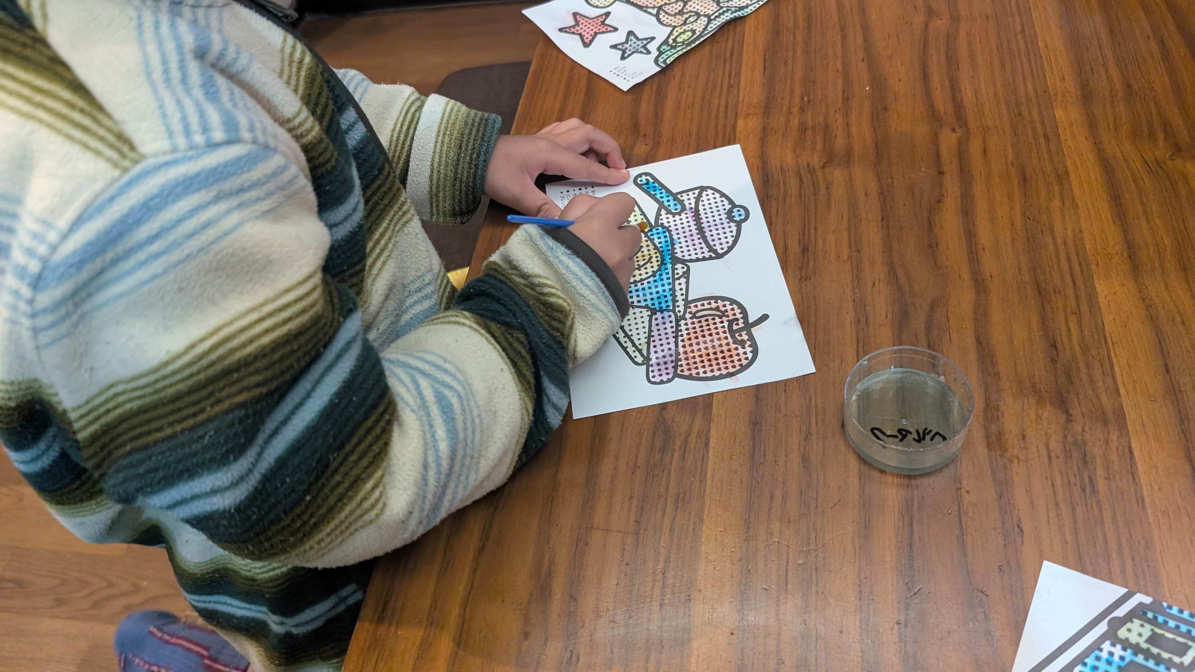 今はいろいろな種類のみずぬりえがありますが、この点々があるタイプを見るのは子どものころ以来。懐かしさに惹かれてこれにしました。笑