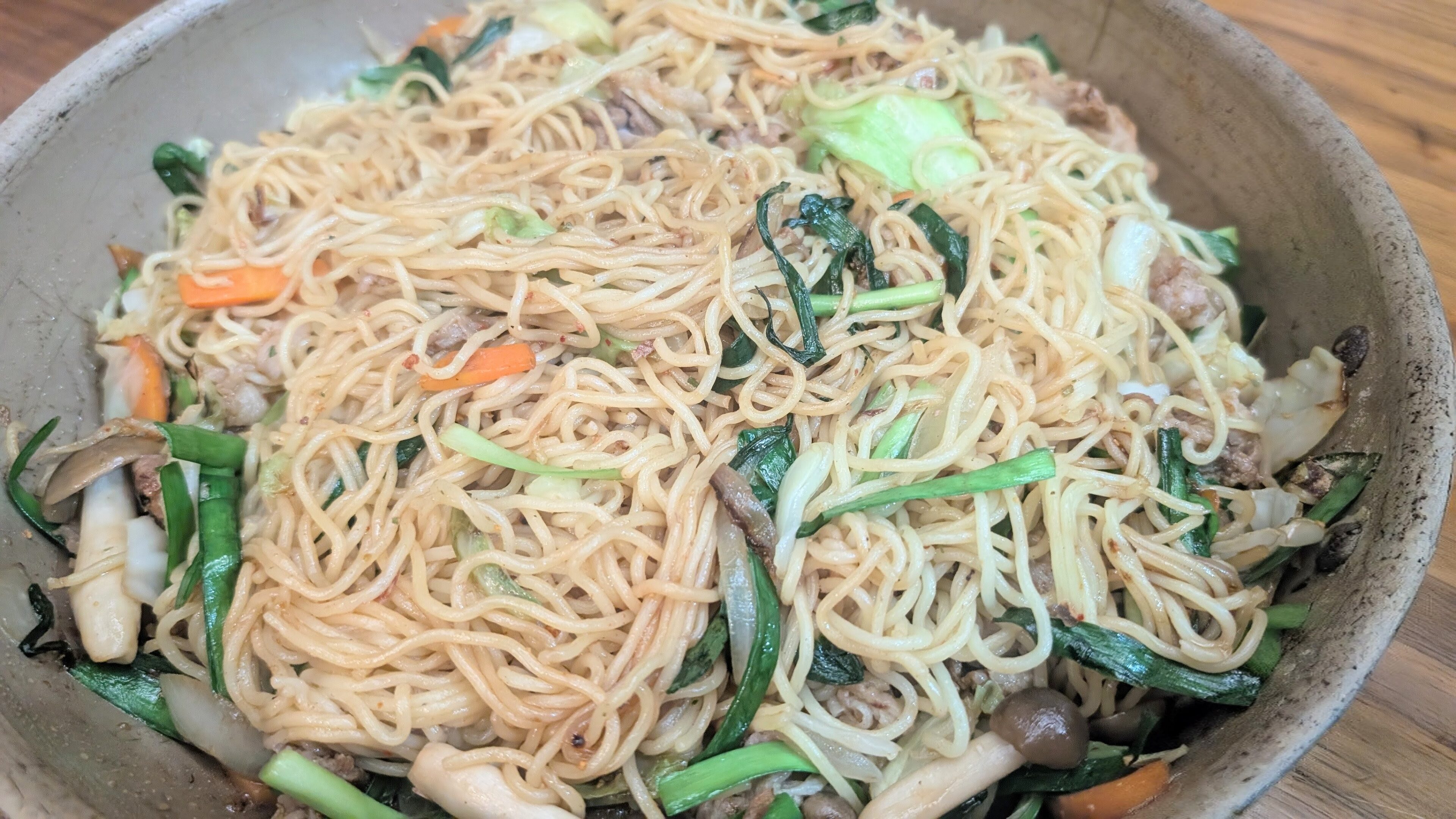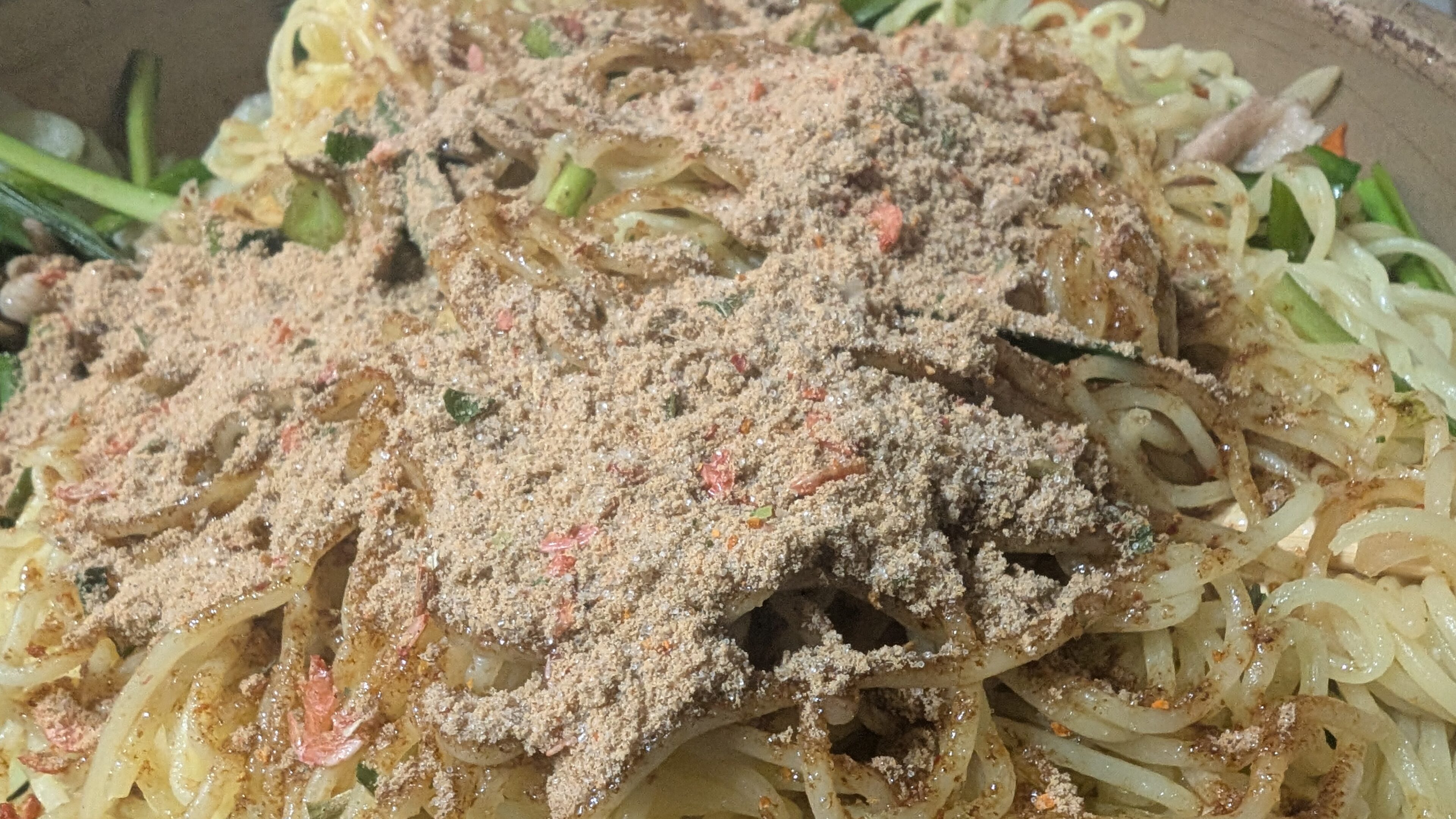 ベースは和風だしがよく効いた醤油味で、かつお節と七味唐辛子が入っているそうです。そこにエビの香ばしさが合わさって、和風焼きそばのような味わいに。