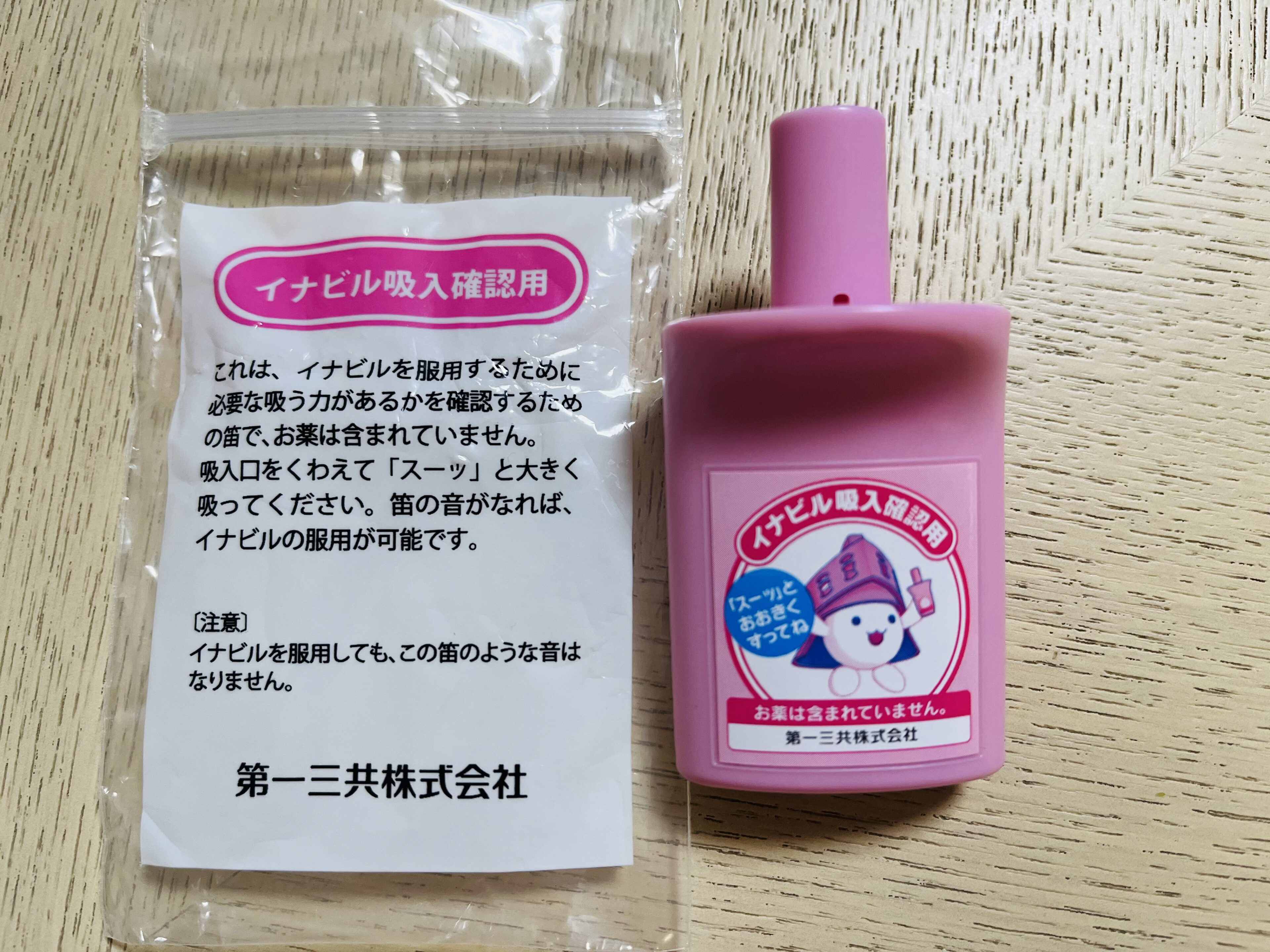 ここにきて、1日1回・1回使い切りのイナビルが登場しました。メリットは1日1回で終わること!デメリットは吸い込む粉がやや苦味があること、粉の量が意外とあるので、ある程度吸い込む力が必要なこと。裏をかえせば、苦い粉が苦手、自分で吸い込めない、むせやすいなどの子はあまりオススメできません。吸い込めるかどうか不安な場合は、吸い込むことができるかチェックできる練習用の笛があるので、お薬を受け取る前にそちらでチェックしてもらうのもいいかもしれません。