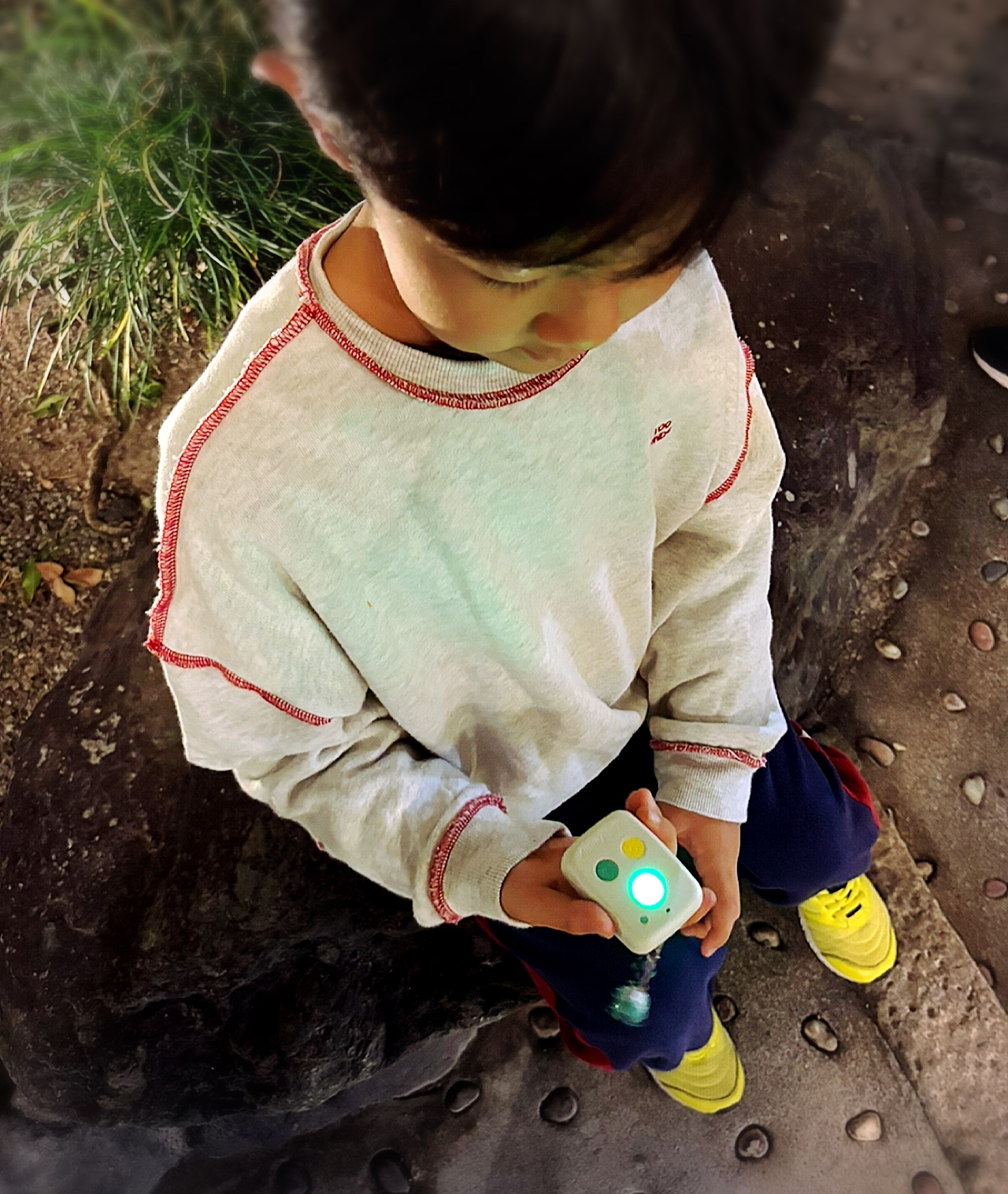 ボタンを押すだけで再生、録音、居場所の通知ができるから、子どもでも使いやすい◎