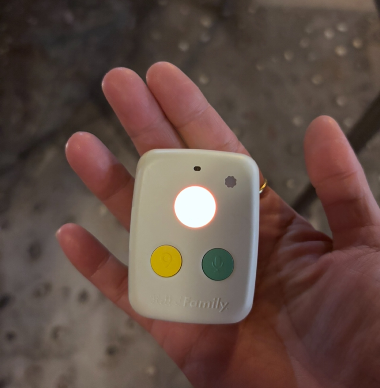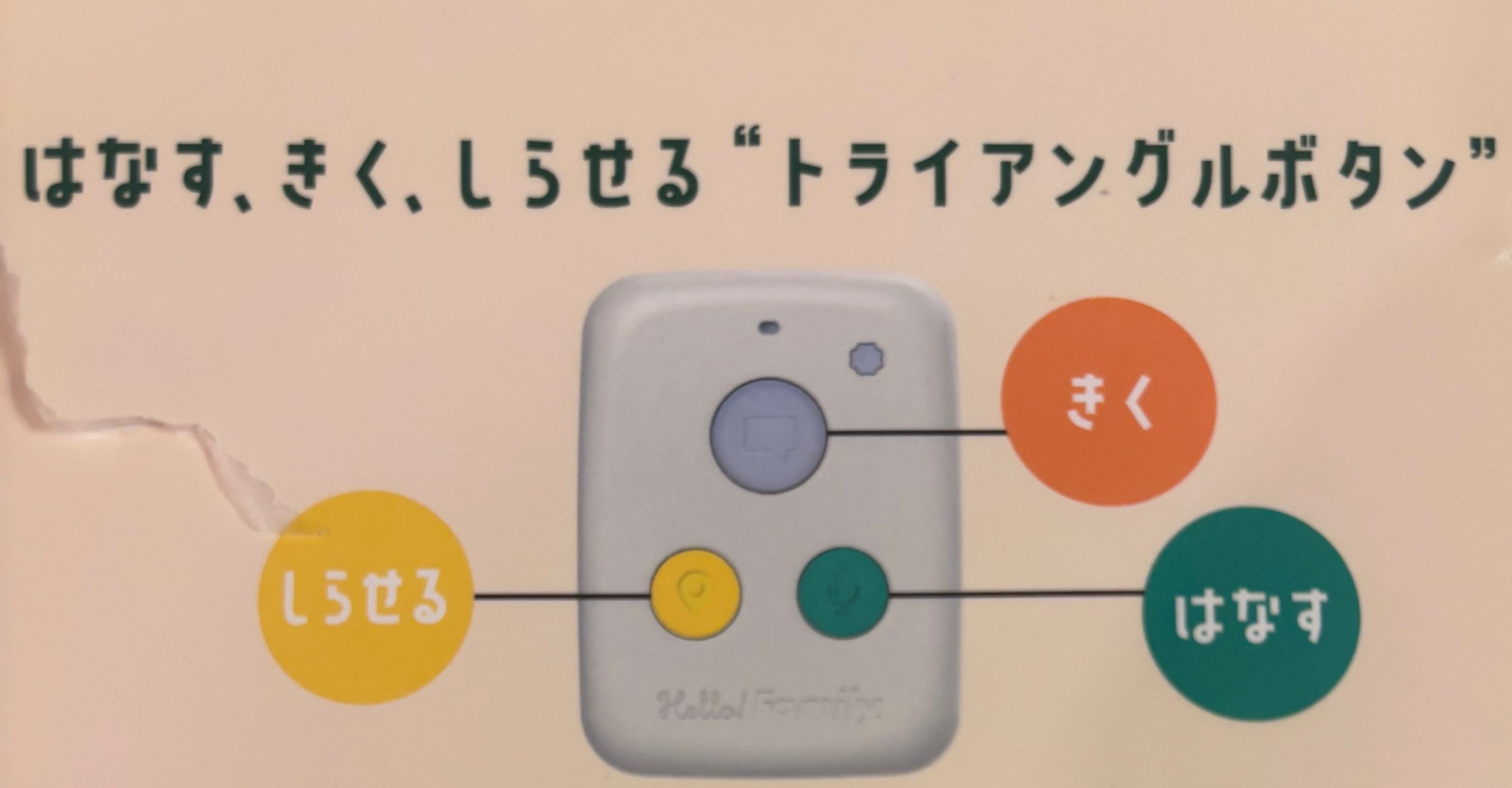 「はろここトーク」は、ママやパパから音声メッセージが来たら、真ん中の再生ボタンが光って点滅してお知らせ。
