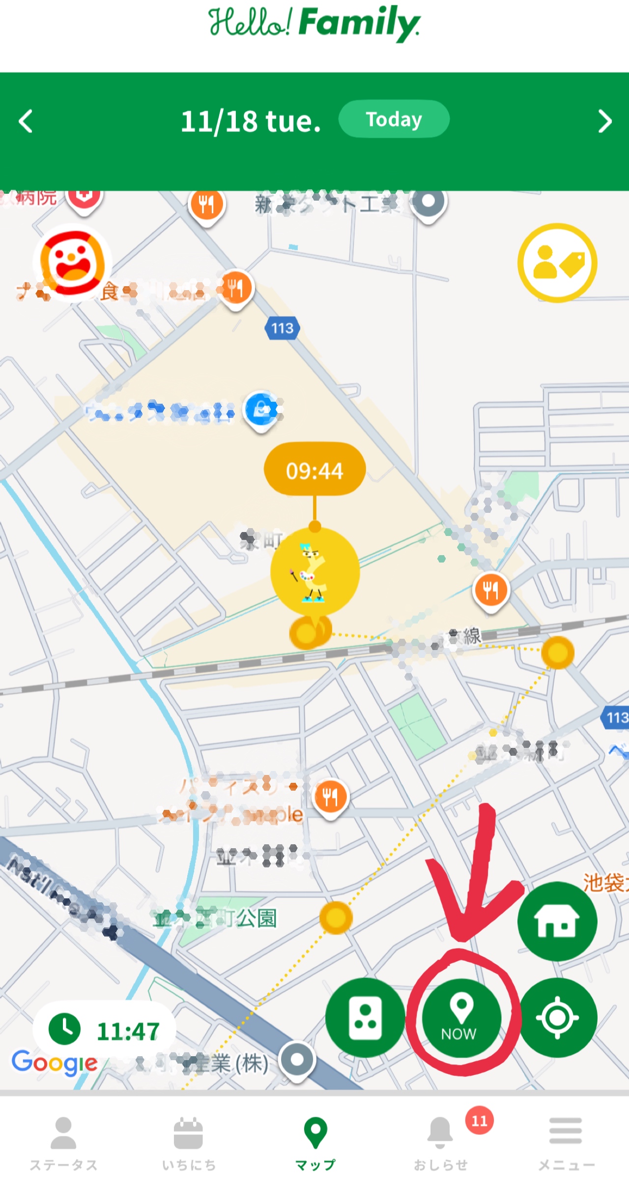 PCやスマホの再読み込みをするように「NOWボタン」を押すと子どもの位置情報を更新することができます。