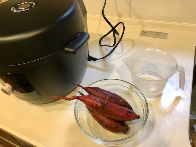 ちなみに、サツマイモは掘ってから1か月ほど新聞紙にくるんで熟成すると甘みが増すそうです。ちょうど1か月ほど経っていた「ふくむらさき」という品種でチャレンジ。さつま芋と水を入れるだけの簡単料理で、ねっとりと濃厚な焼き芋が仕上がりました。