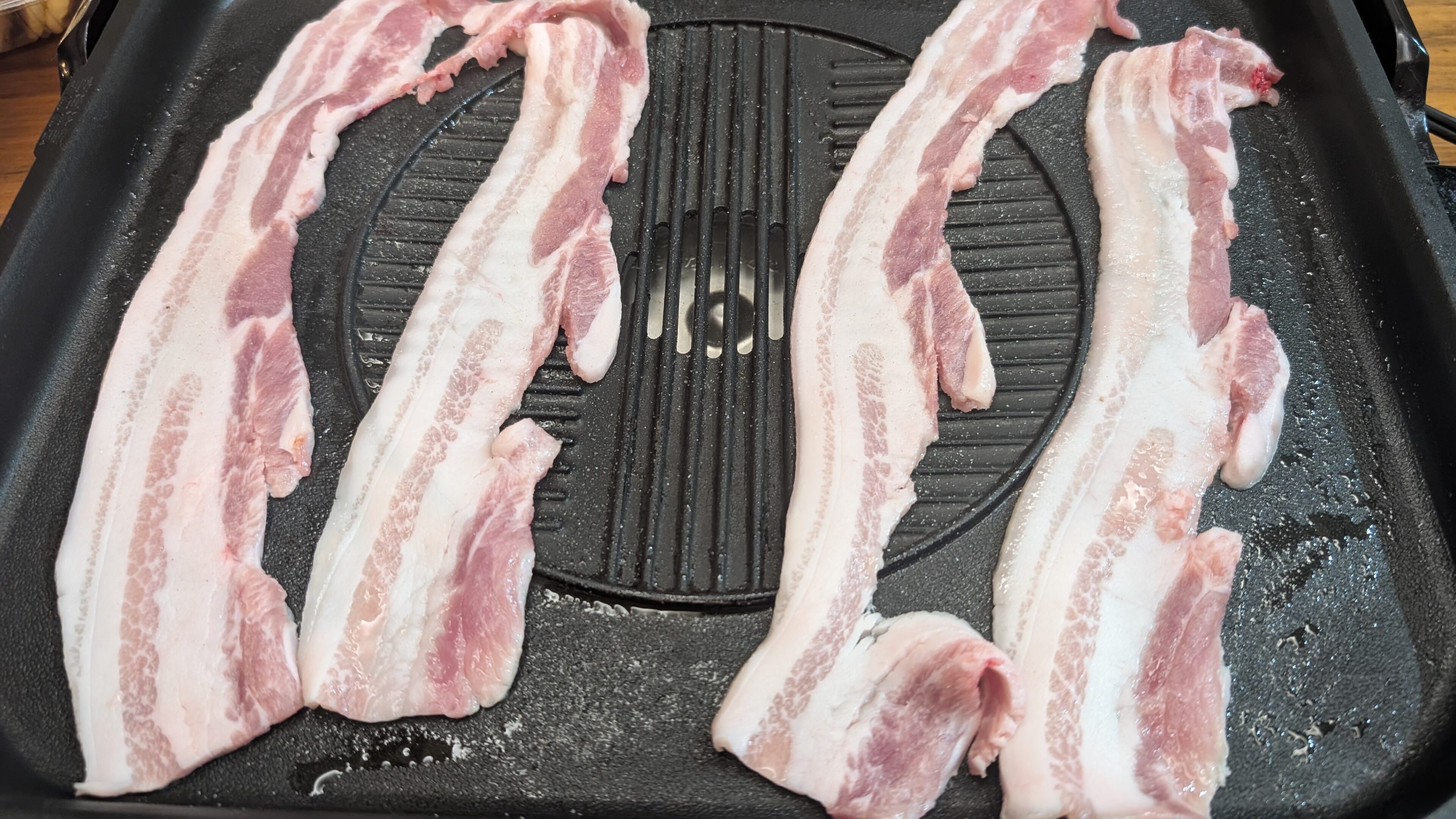 長い豚肉をそのまま焼いて少々塩コショウを振り、焼けたらハサミで切るだけ。
