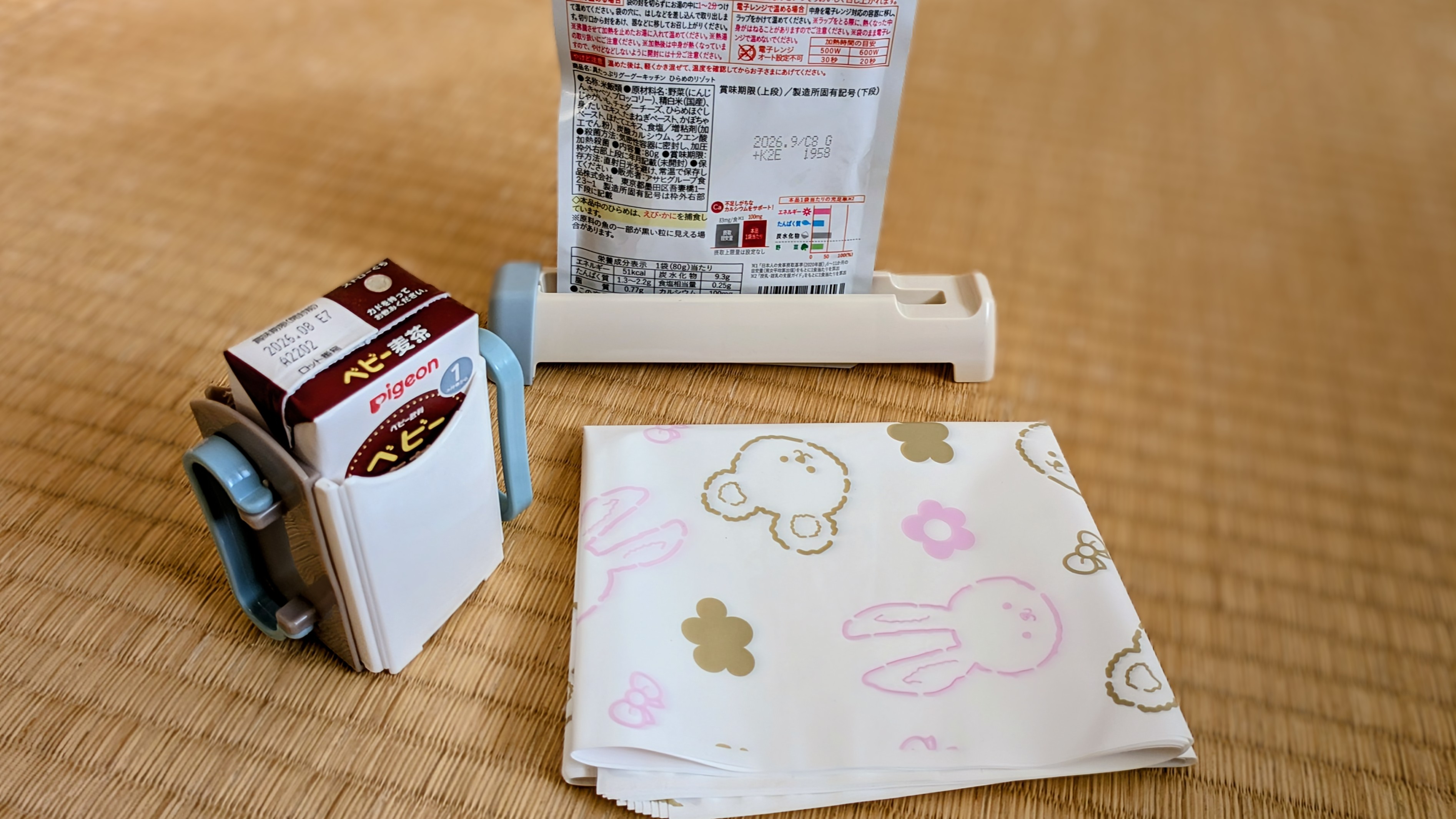 お食事グッズでは、使い捨てエプロン、ドリンクホルダー、離乳食パウチスタンドを購入。