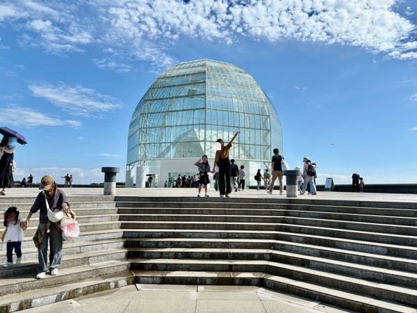 海辺にある葛西臨海水族園は、青空と海がキレイに撮れる映えスポット!入口の大きなガラスドームからすでに気分が上がります。
