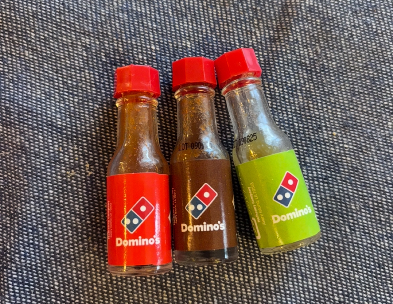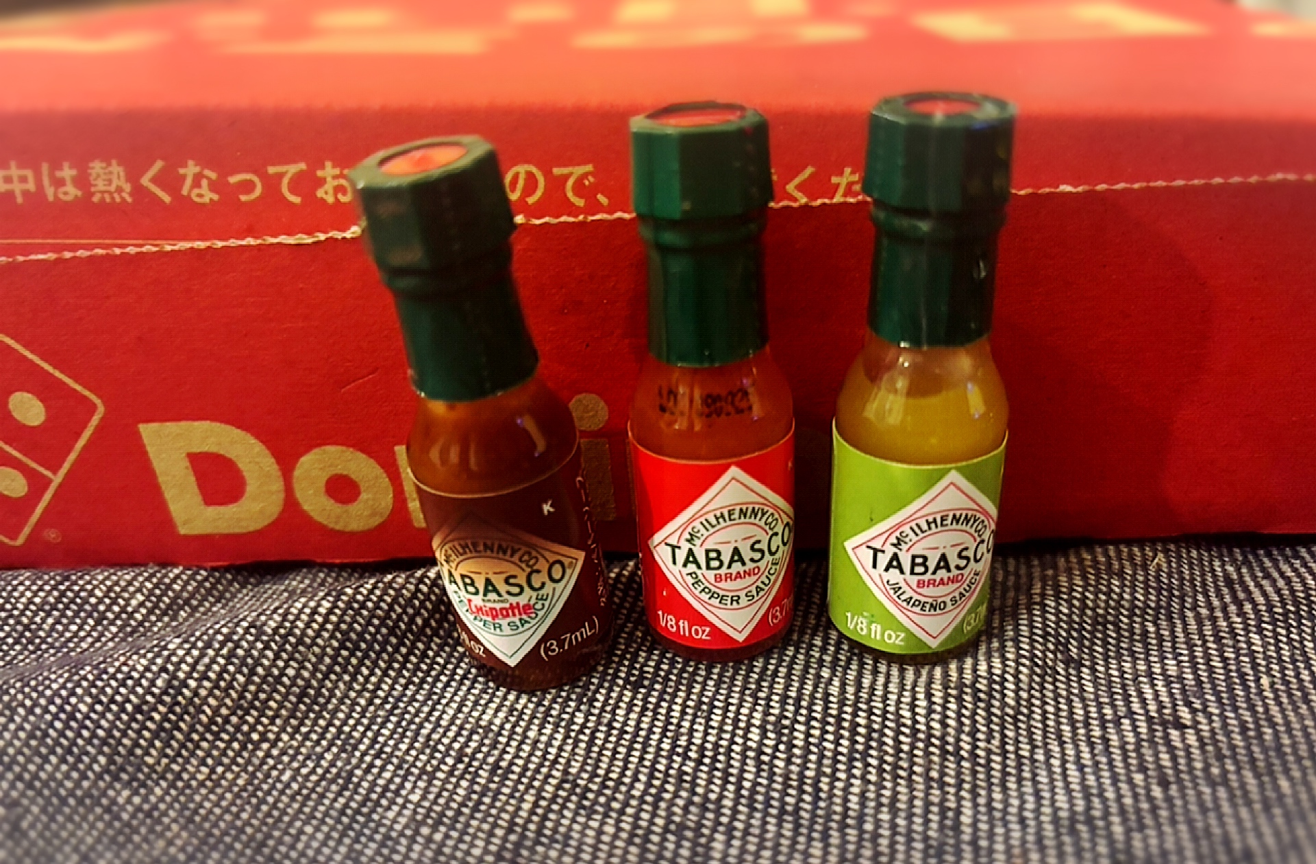ドミノピザでしか手に入らない、かわいいミニボトルのタバスコ。