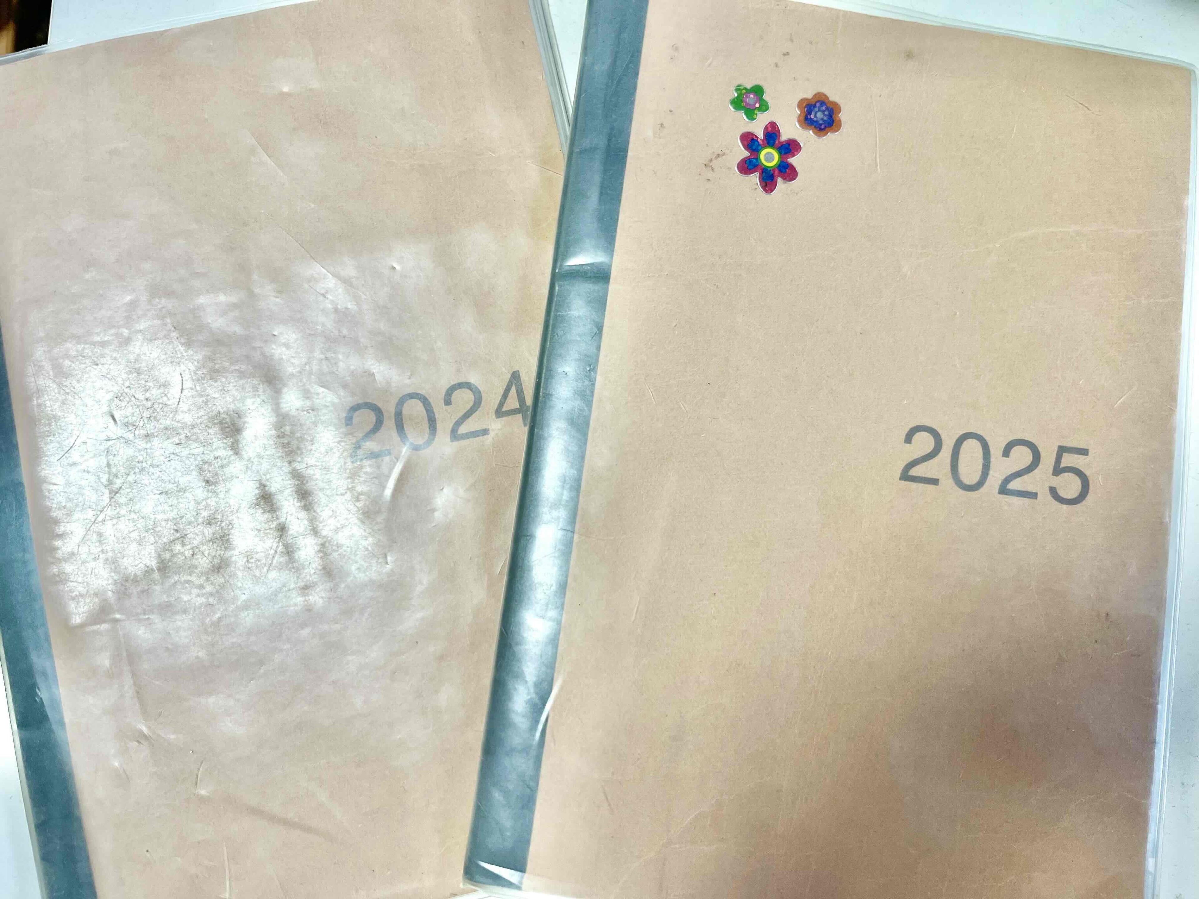 使い終わったスケジュール帳はノートと一緒に立てておいているのですが、薄手で場所を取らないので去年、一昨年までは見返す用に保管しています。