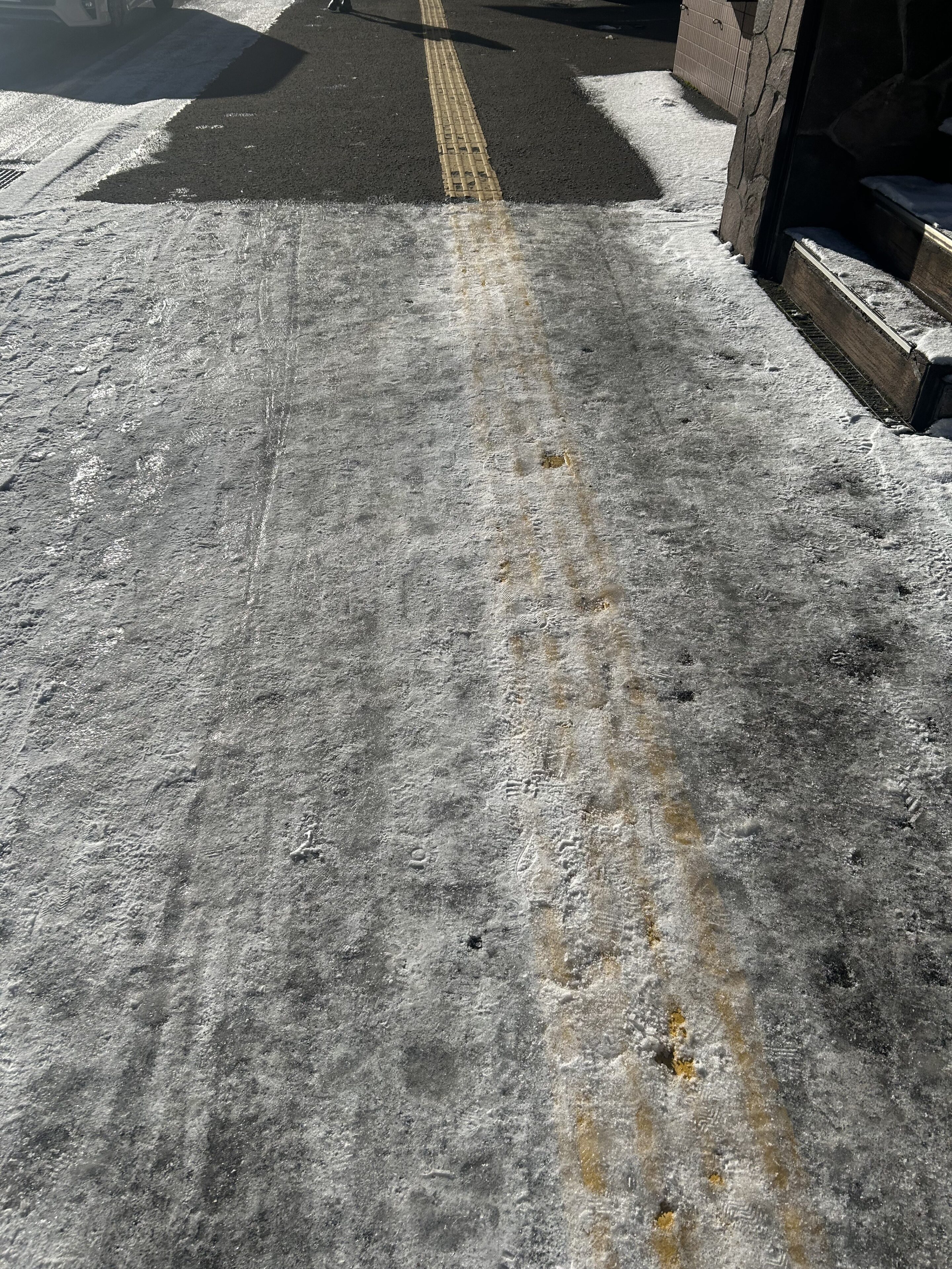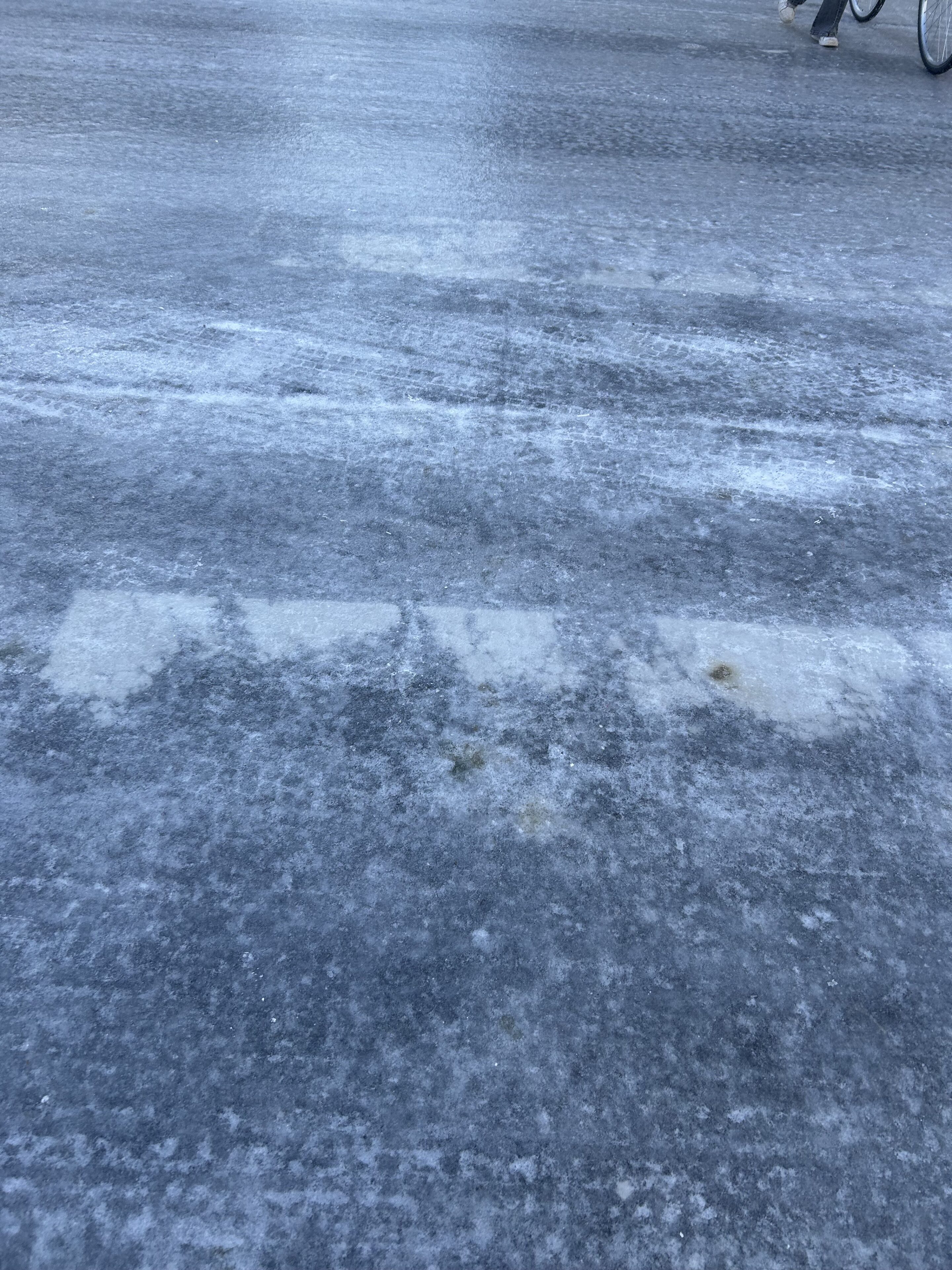 ただでさえ凍っていて滑りやすいのに、横断歩道の白線部分はさらに滑りやすいんですよね…。