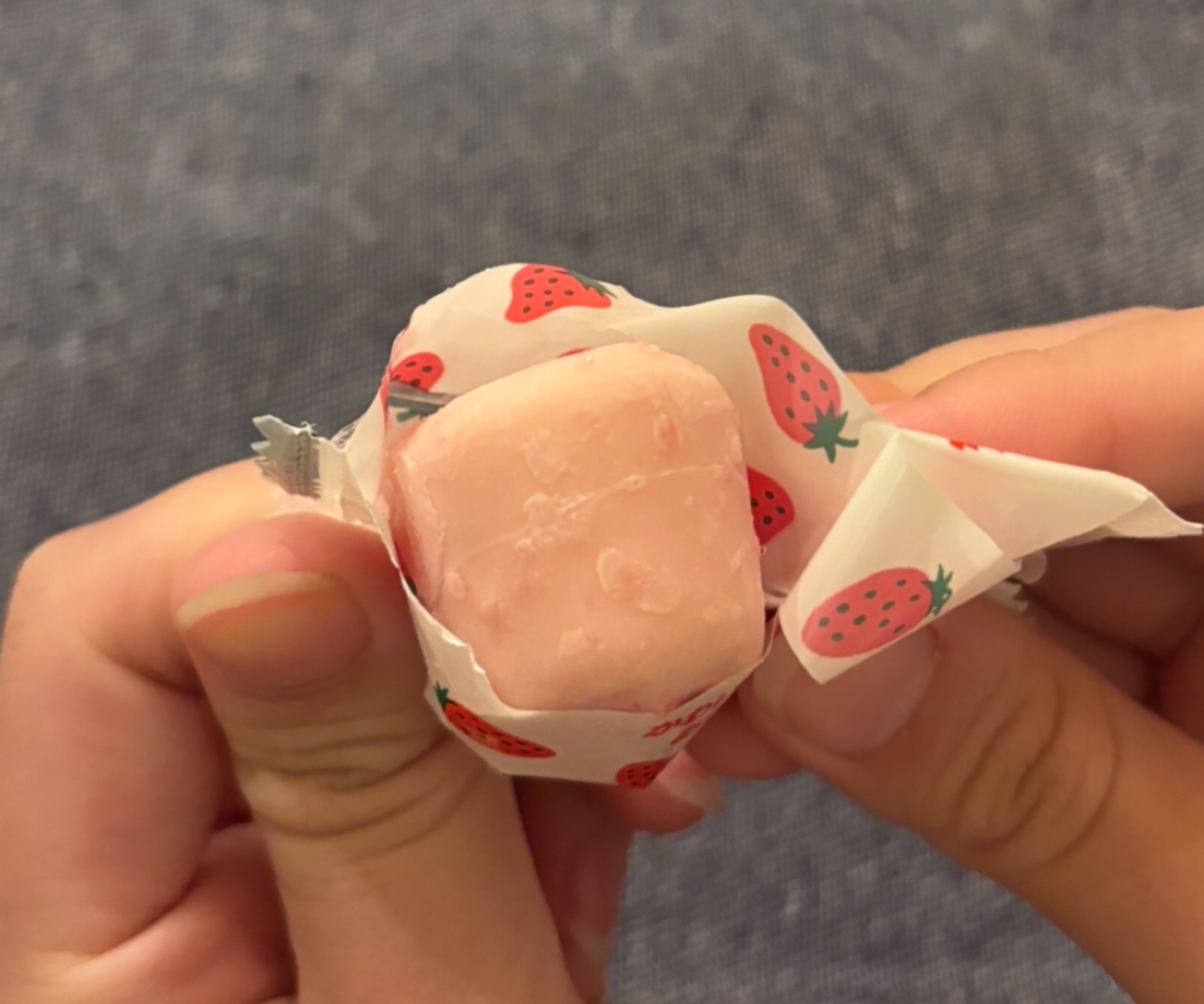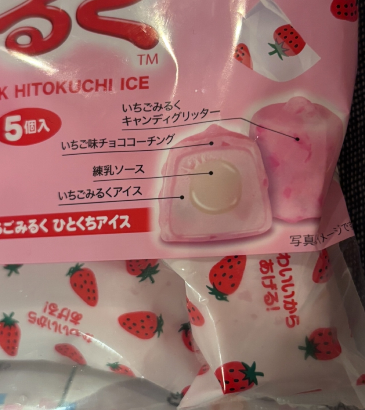 いちごみるく」が1口サイズのアイスになっていて、いちごみるく味のアイスの中に、甘みとコクのある練乳ソースがたっぷり。