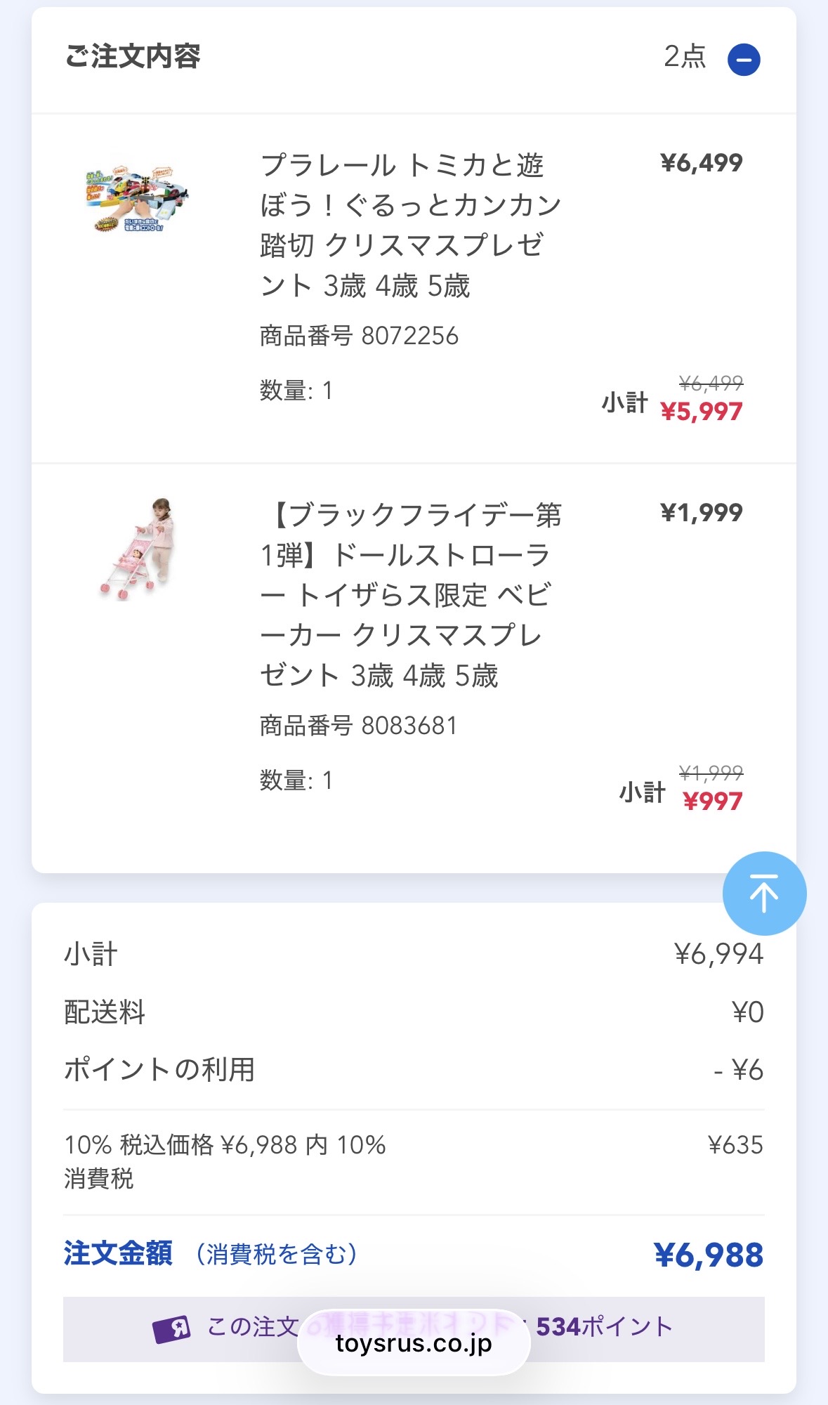 6988 − 349(PayPay)− 635(トイザらスポイント)= 実質6004円