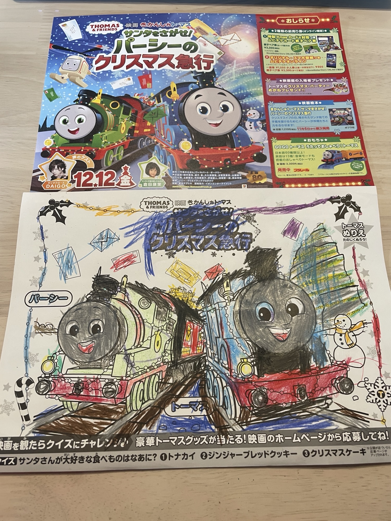 トーマスの映画では、公開前に塗り絵が配布されていることが多く、わが家も毎回もらっています。