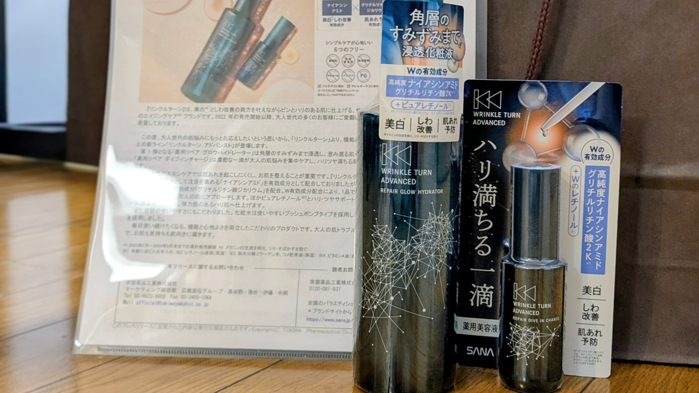 「「リンクルターン」シリーズから「リンクルターン アドバンスト」の商品説明をお聞きしました。年齢サインが気になる方に向けた商品という説明でした。ベルガモット&ラベンダーの香りが心地よかったです。そして、化粧液と美容液をお土産にいただきました。嬉しい!