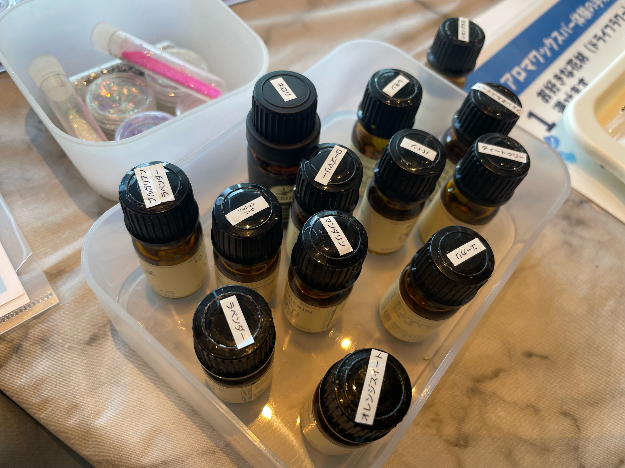 ワークショップではまず初めに、匂い選びから始まります。いろんな種類があって、一つずつ嗅いでいきながら好みの匂いを探していきました。