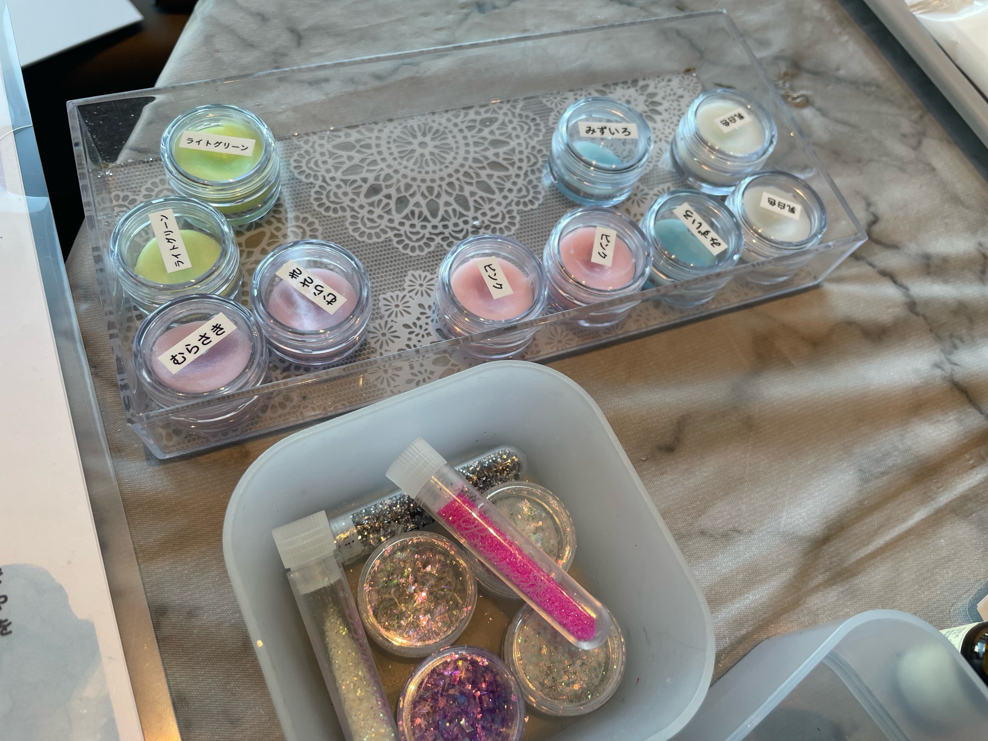 ワークショップでは、ソイワックスとパラフィンワックスを溶かし、アロマオイルと色味を入れた物を用意してくれていました。