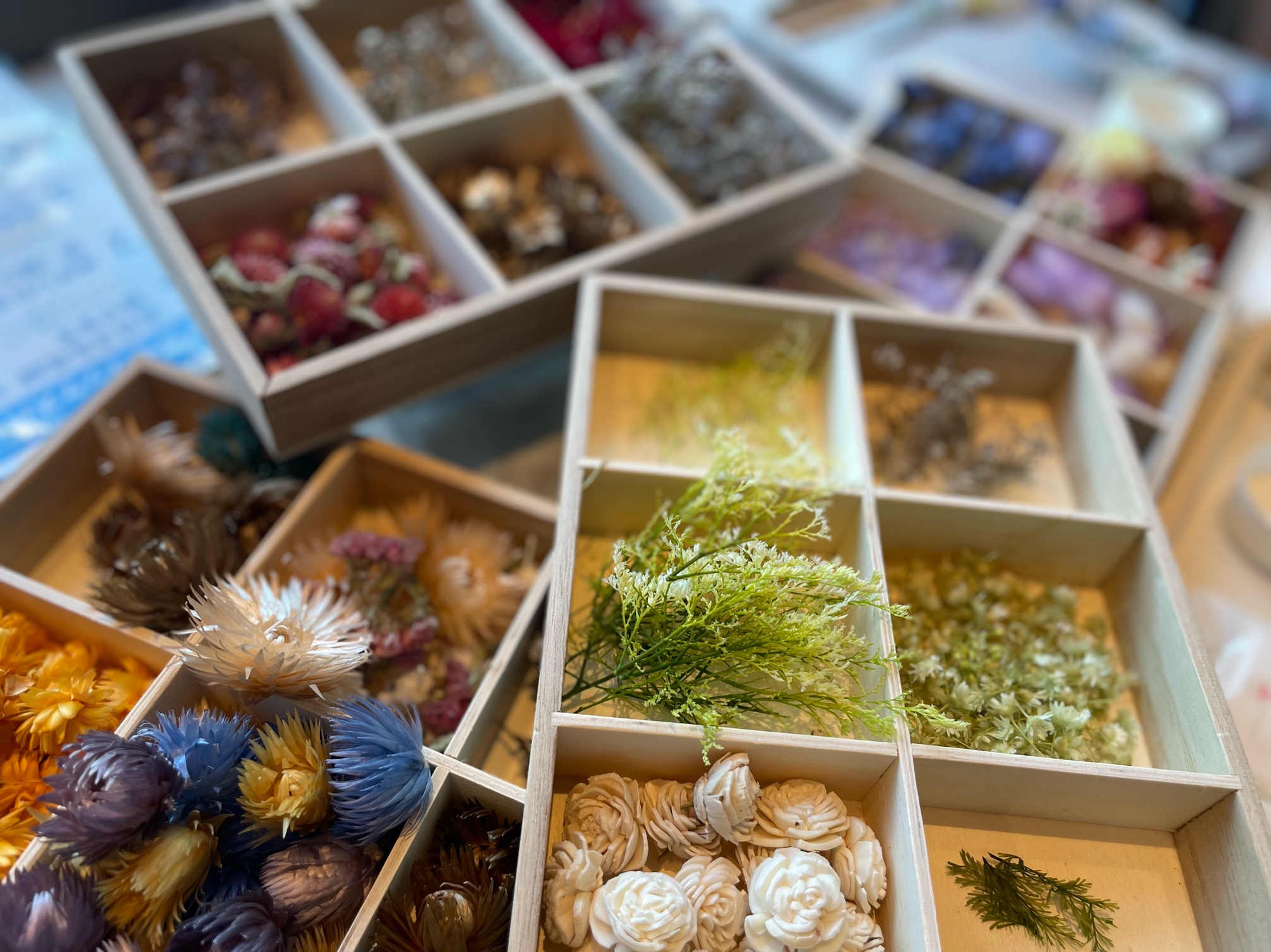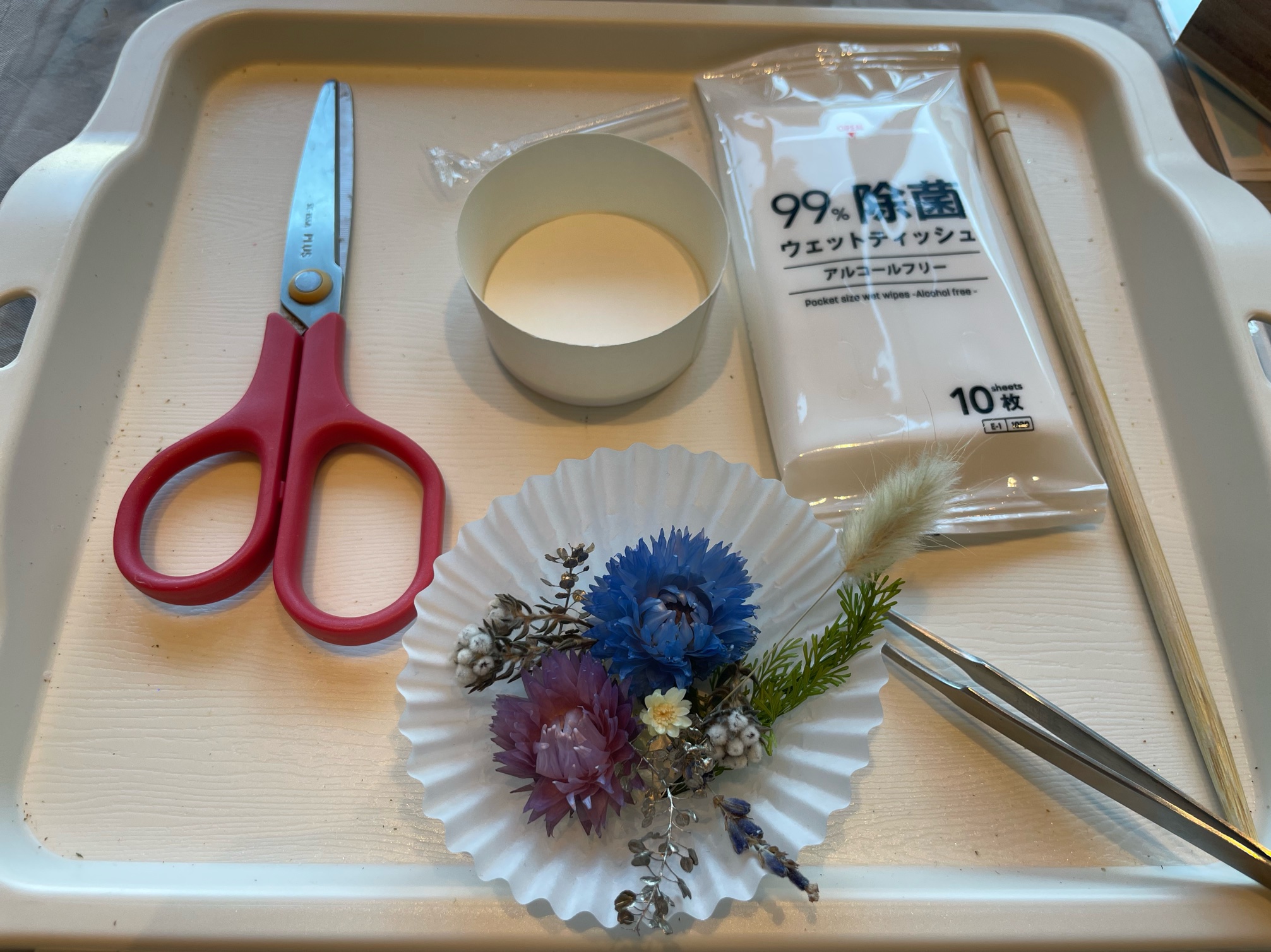 ドライフラワー(花材)を選んでいきます。どのドライフラワーも可愛くて、どれも使いたくなるという誘惑に駆られながらも、