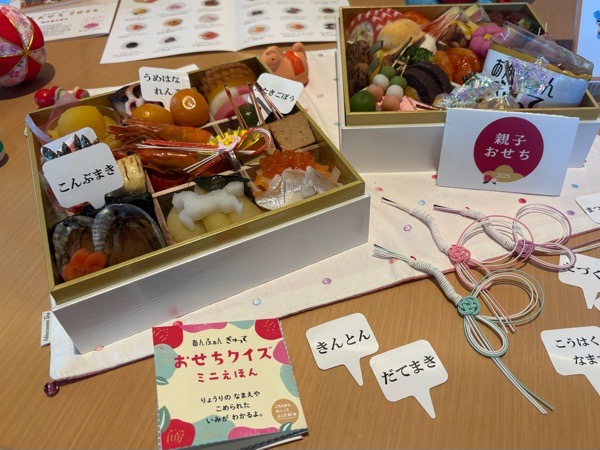 一段目は昔ながらの伝統的なおせち、二段目は子どもも喜ぶ洋風おせちです。これはおもしろい!吹き出しの表に具材、裏に由来が書いてあり、親子で楽しめること間違いなし。このおせち、たくさんの人に知って欲しいなぁ。