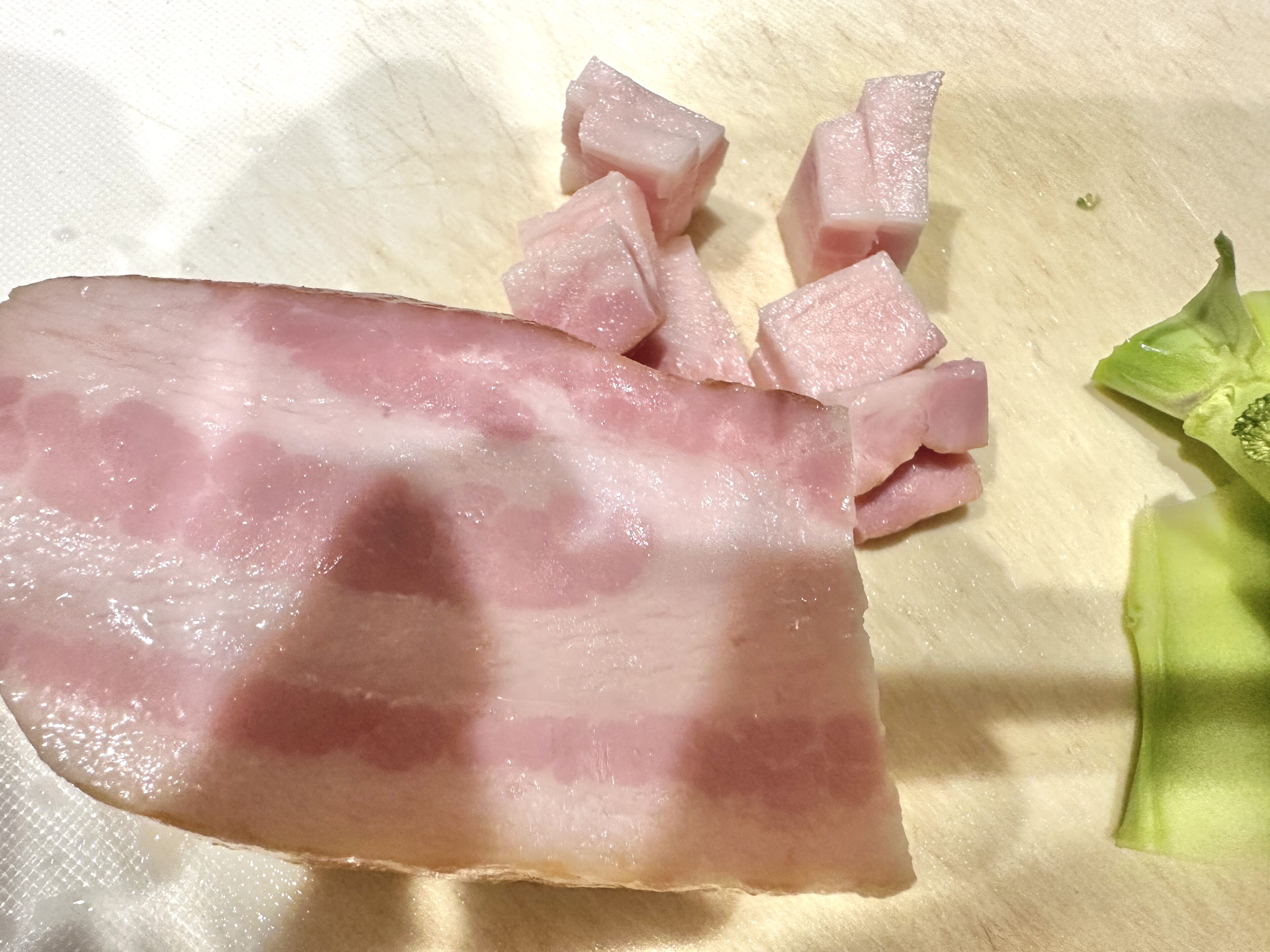 ベーコンを1cm×2mmくらいで切っていきます!