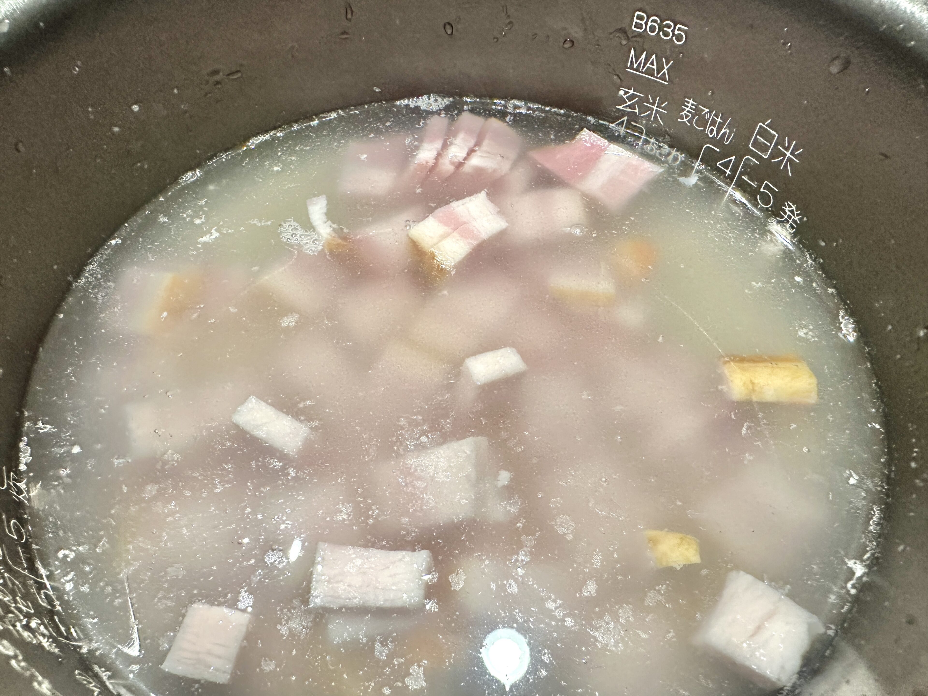 3)ベーコンを切って、炊飯器に入れる