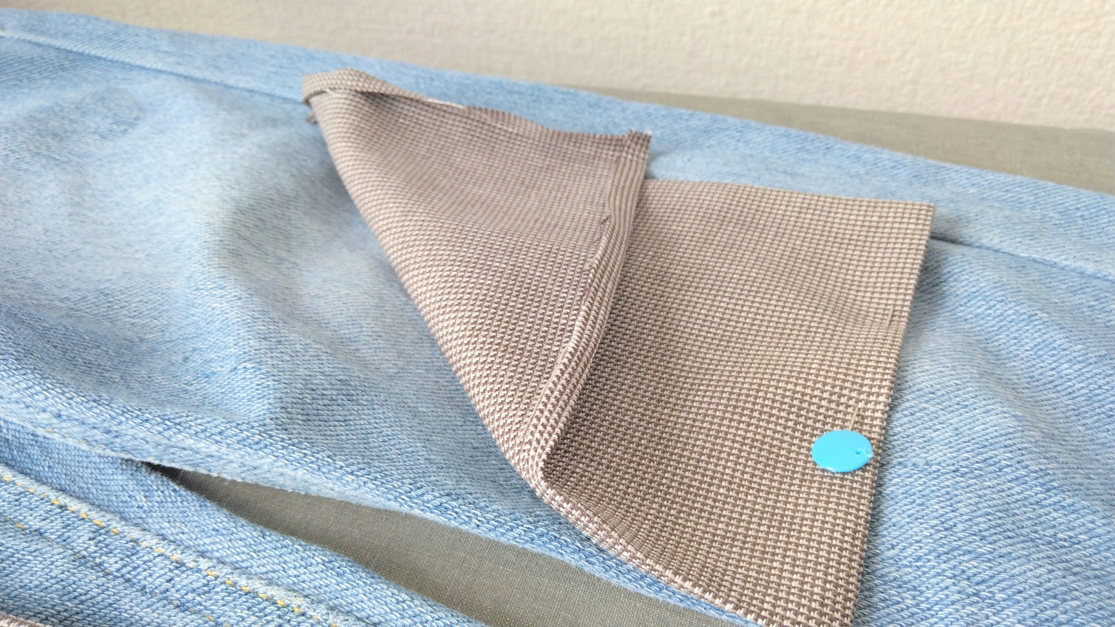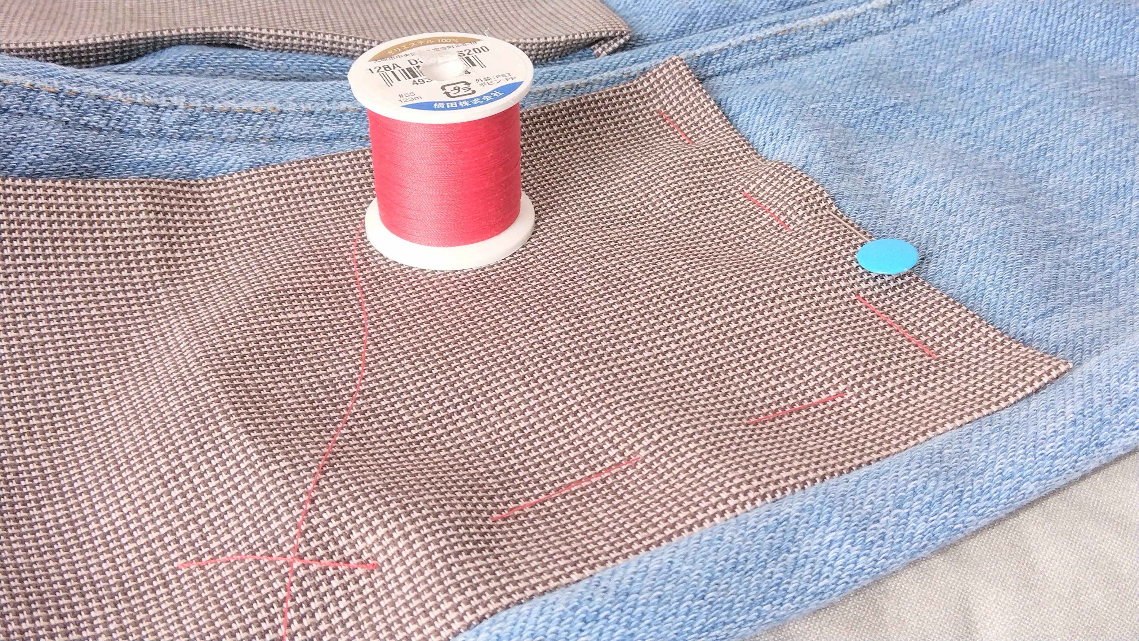 広範囲の傷みには、仮止めした布を並縫いで固定。これなら洗濯にも強く、長持ちします。
