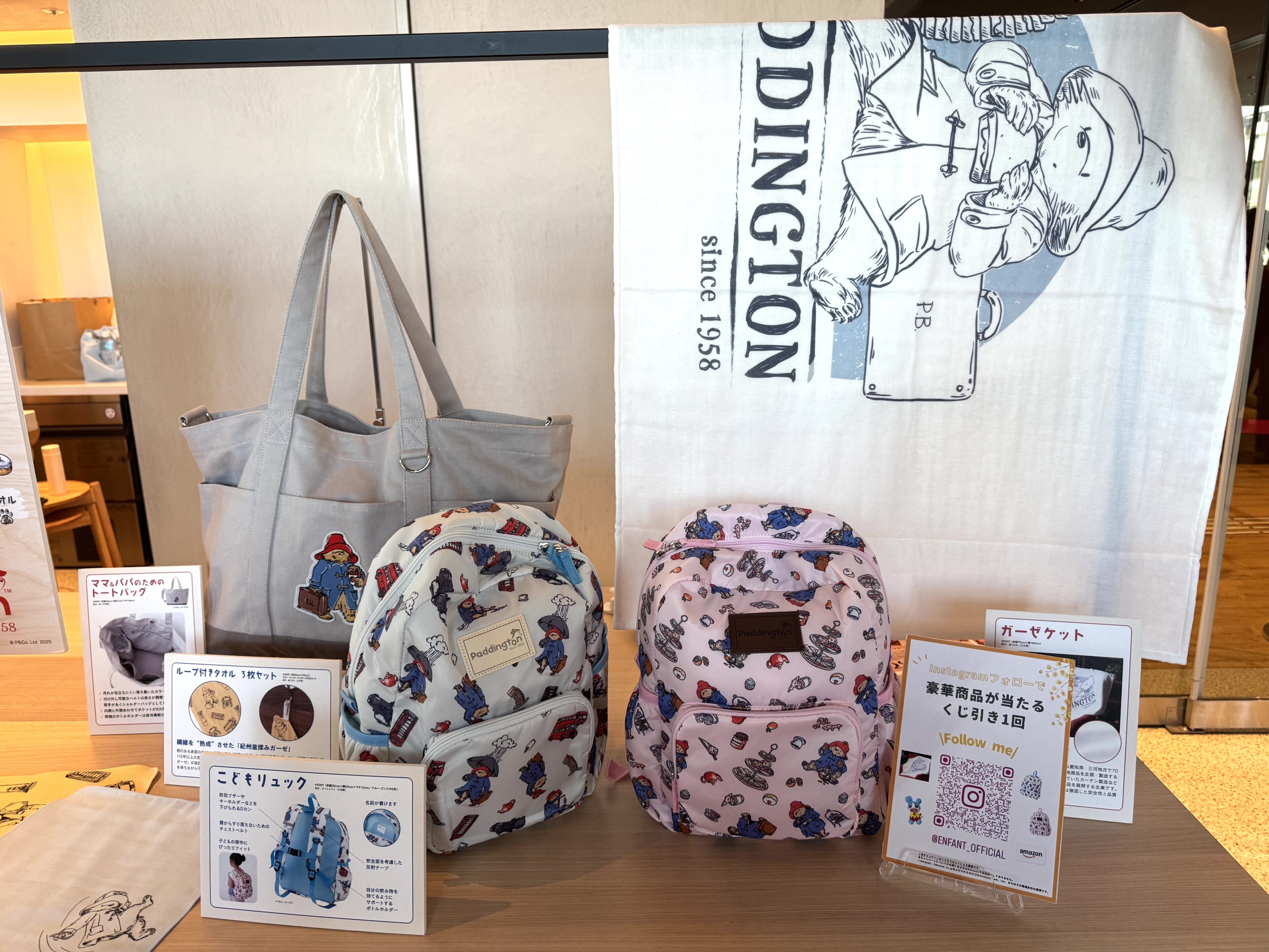 発売中のコラボ商品が展示してありました。リュックは青が人気とのこと。