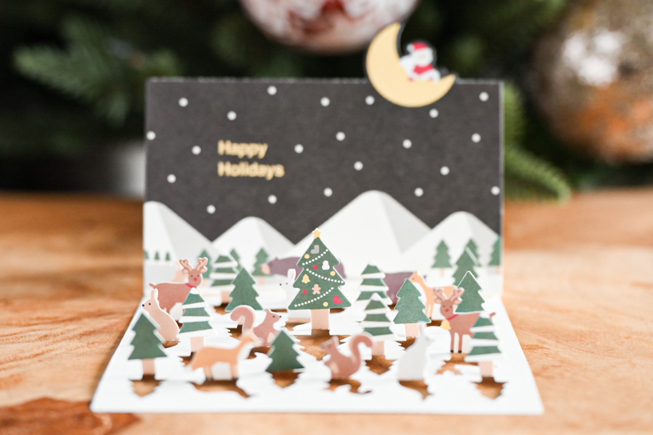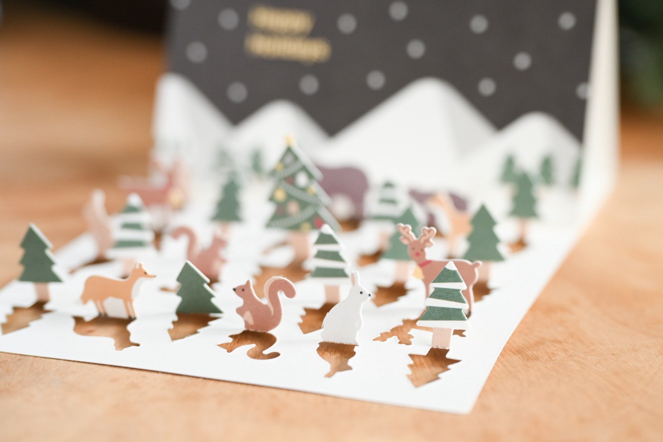 冬の夜景に様々な動物が登場する、大人も楽しめる上品なデザイン。