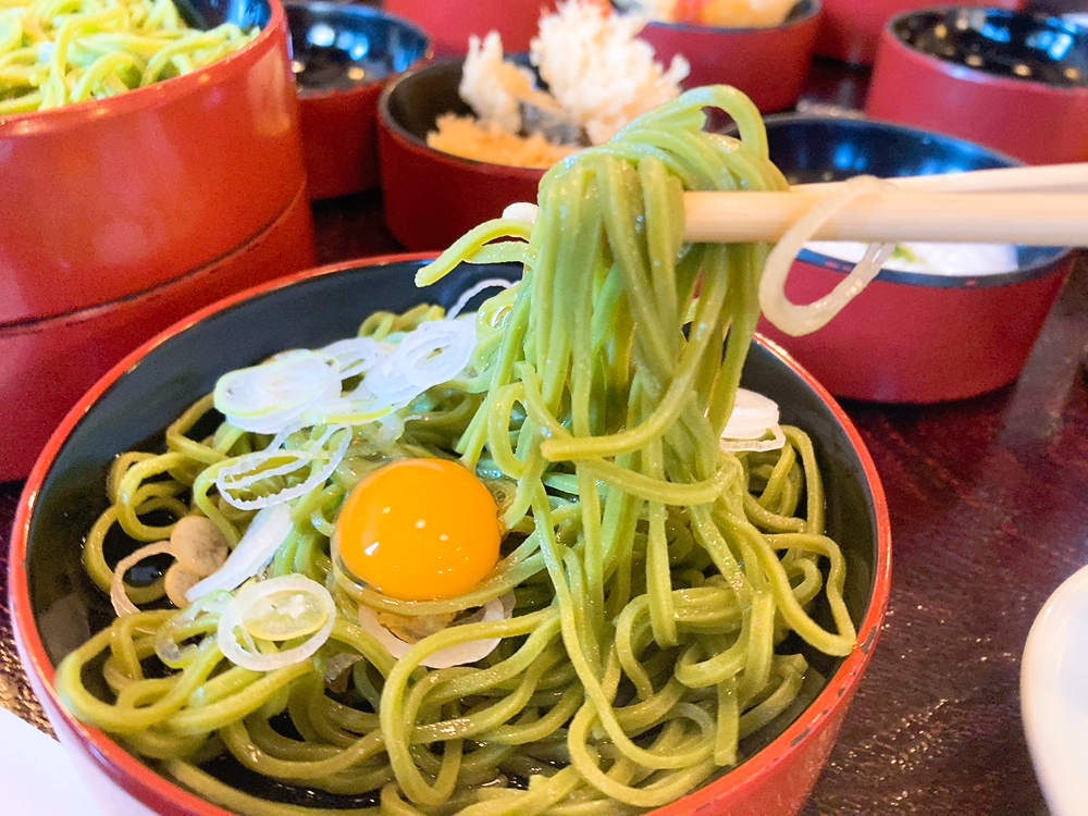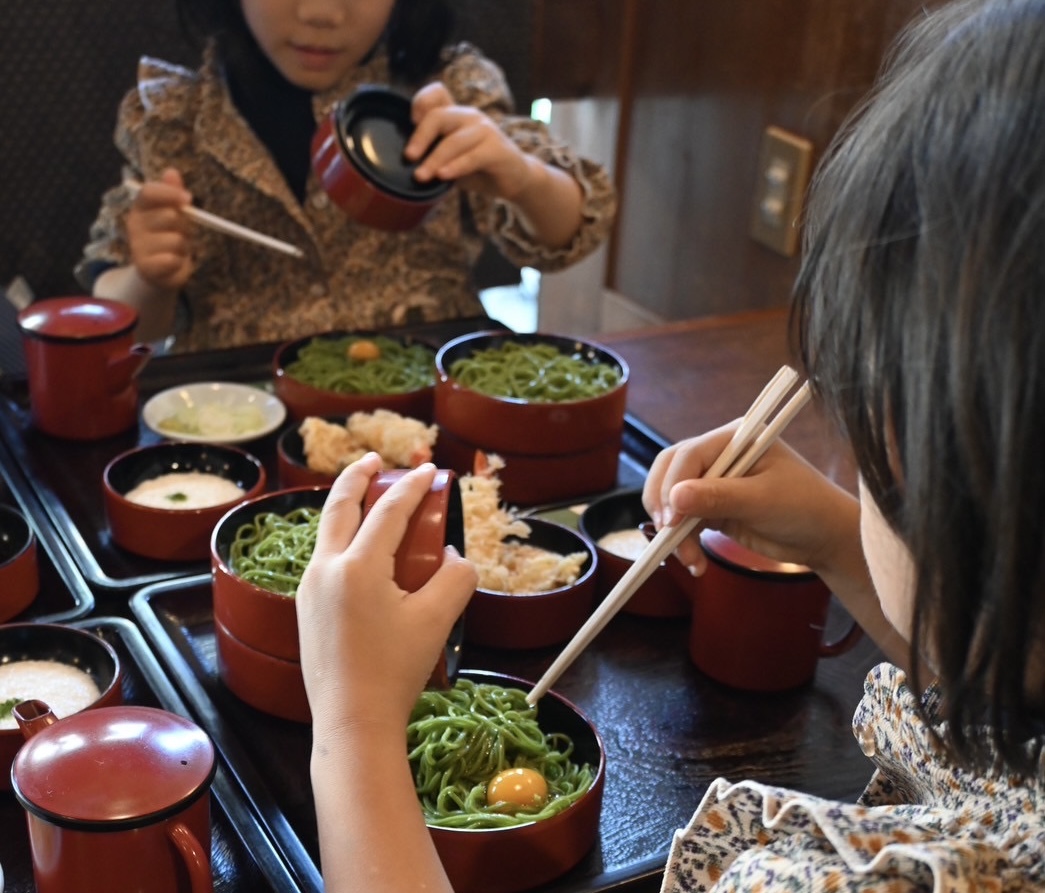 運ばれてきたのは、目にも鮮やかな緑色をした美しい茶そば!3段それぞれにつける、うずらの卵ととろろ、そして天ぷらが小鉢に入り、見た目にも華やかです◎蕎麦好きTwinsも、3段も!と嬉しそう。