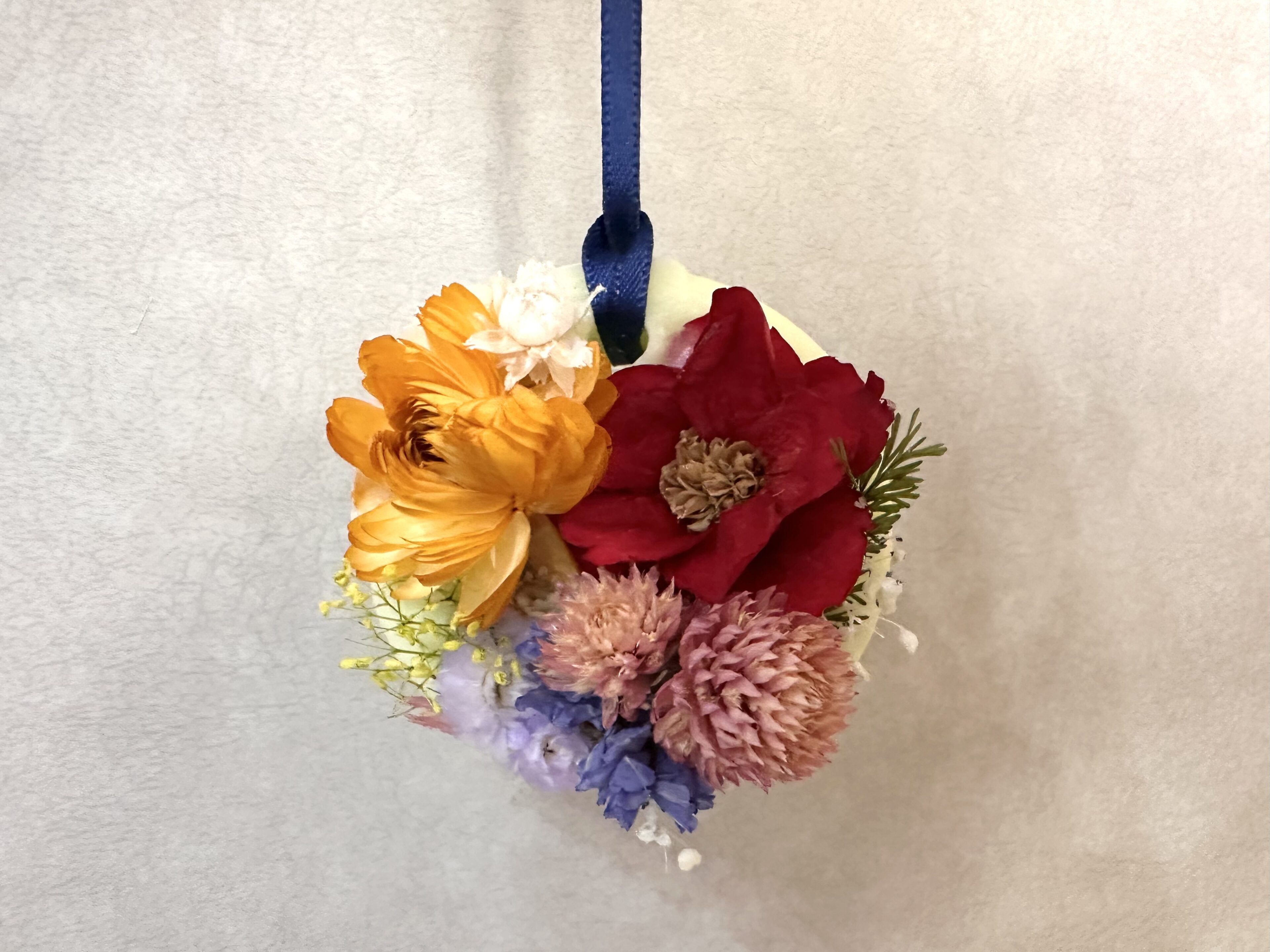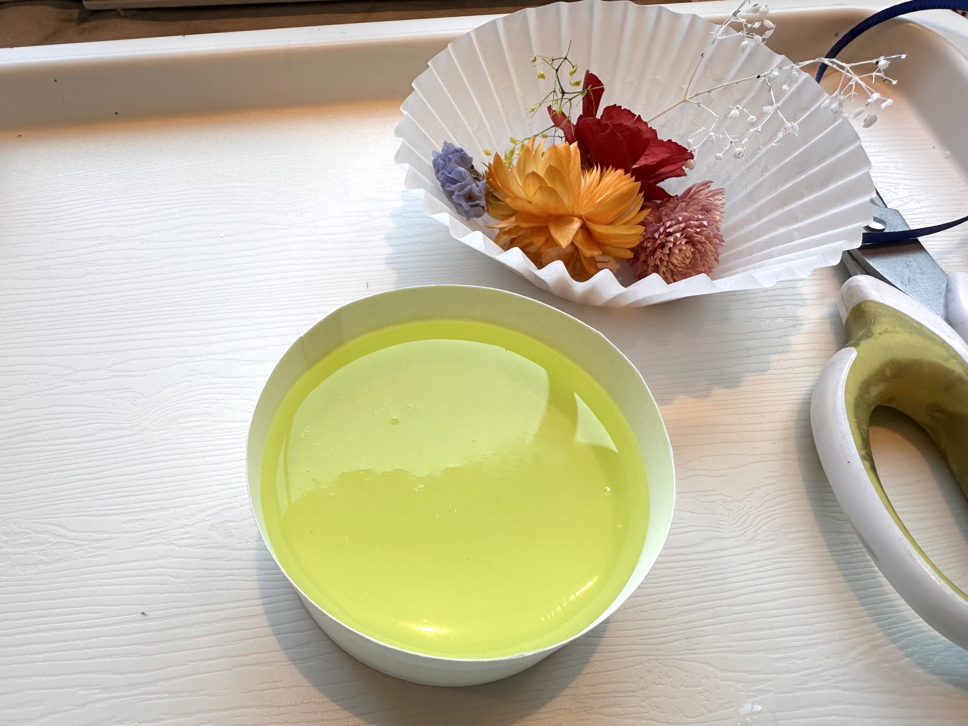 2.完全に固まる前にドライフラワーやラメ、リボンで自由に飾り付けをする
