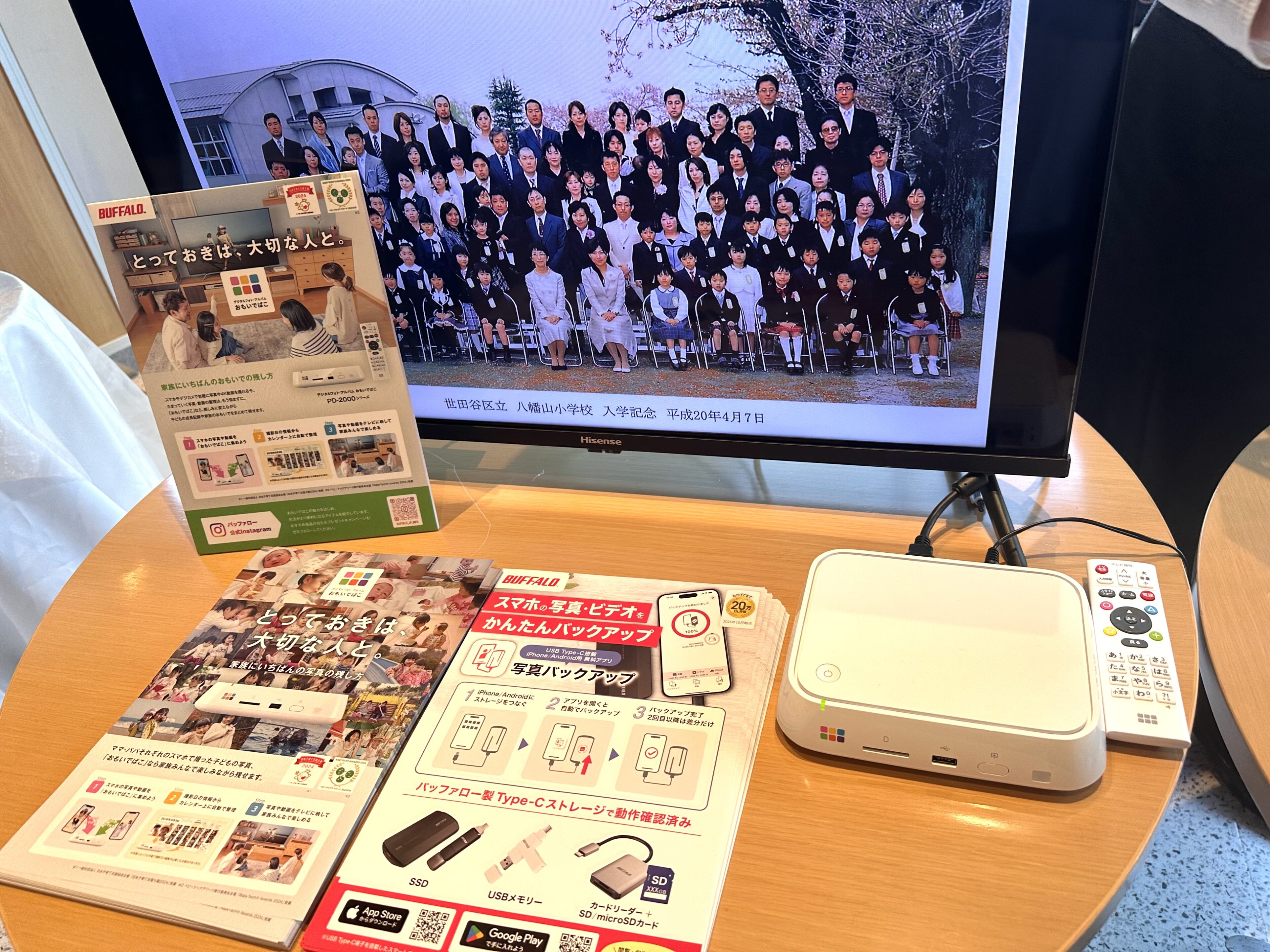 Wi-FiルーターやSDカードで有名なバッファローでは、「写真バックアップ」アプリを利用して簡単な操作でハードウェアにバックアップができる仕組みと、「おもいでばこ」という写真を自動で整理してくれる商品を見せていただきました。