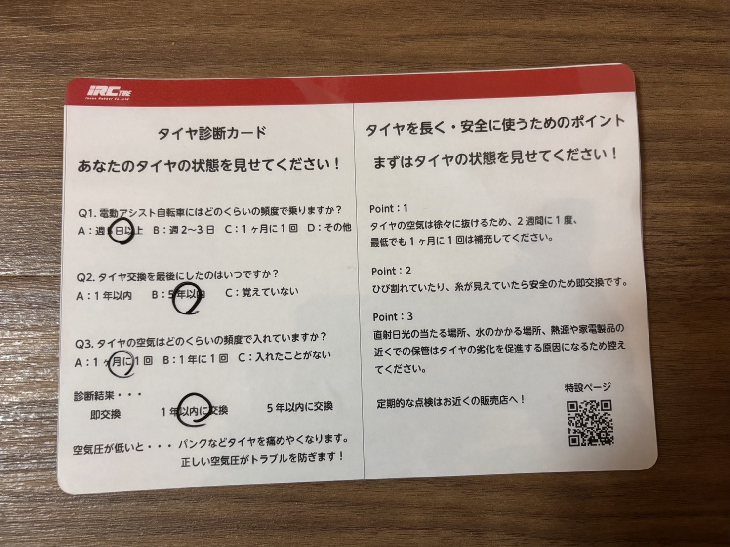 電動自転車の交換用タイヤ「足楽neo」。正直、タイヤは買ったままずっと使うものというイメージでしたが、実は月1回の空気入れなど日々のメンテナンスが大切とのこと。5年以上乗っているなら交換の検討も必要と聞いて、とても勉強になりました。