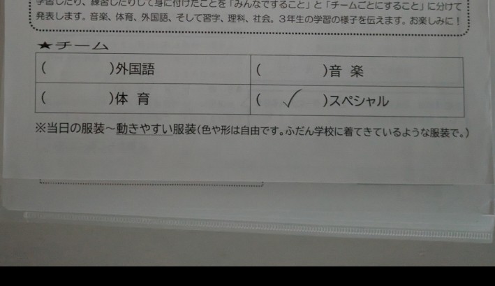 今年は何をやるのか聞くと「スペシャルだよ」と一言。え、何それ?貰って来たチーム分けのプリントでも、長男は「スペシャル」にチェックが入っていました。