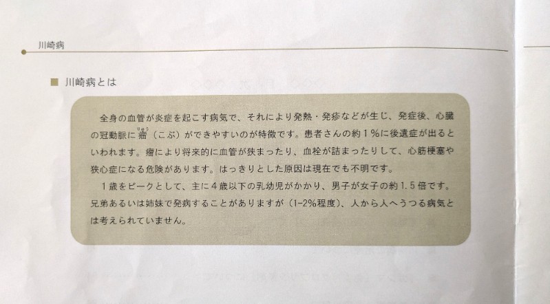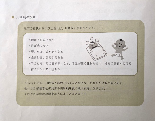 ただ申し送りはしっかりされており、翌日医師よりまだ断定はできないけれど『川崎病』の可能性があること、ただこの病気に当てはまる症状が長女の場合は少ないこと、けれど他の病気は見当たらず昨日の発疹から川崎病の可能性が急上昇してきたこと、今後の検査結果によって、他の病気が陰性なら川崎病の可能性が高いとして治療を進めていくこと等が説明されました。