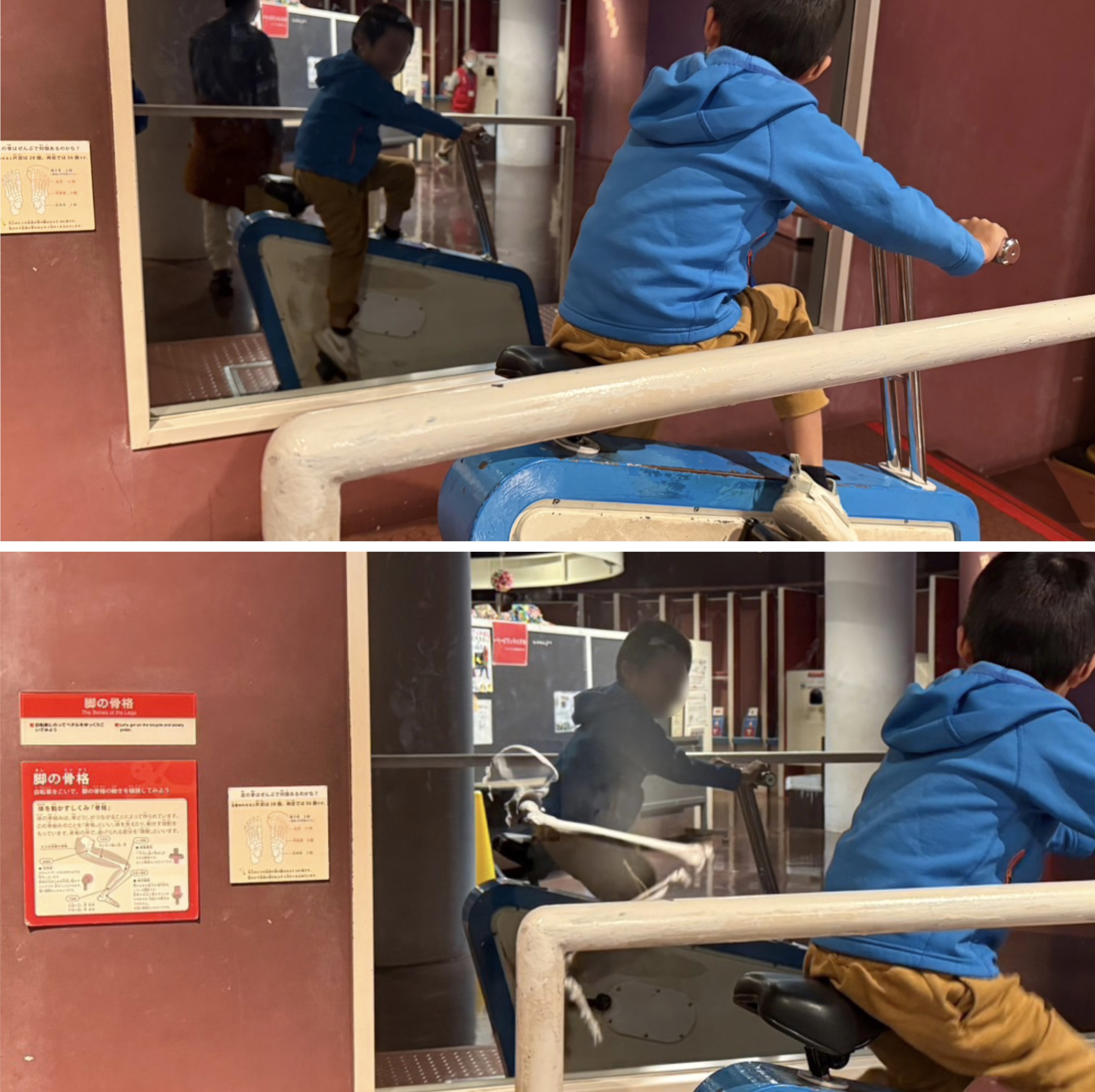 からだの部屋で息子がハマったのは、自転車のペダルを漕ぐと横にある鏡に骨盤と足の骨が写し出されるもの。どのように骨が動くのか見ることができます。知恵の輪に挑戦できるコーナーもあり、みんなで大苦戦しました。