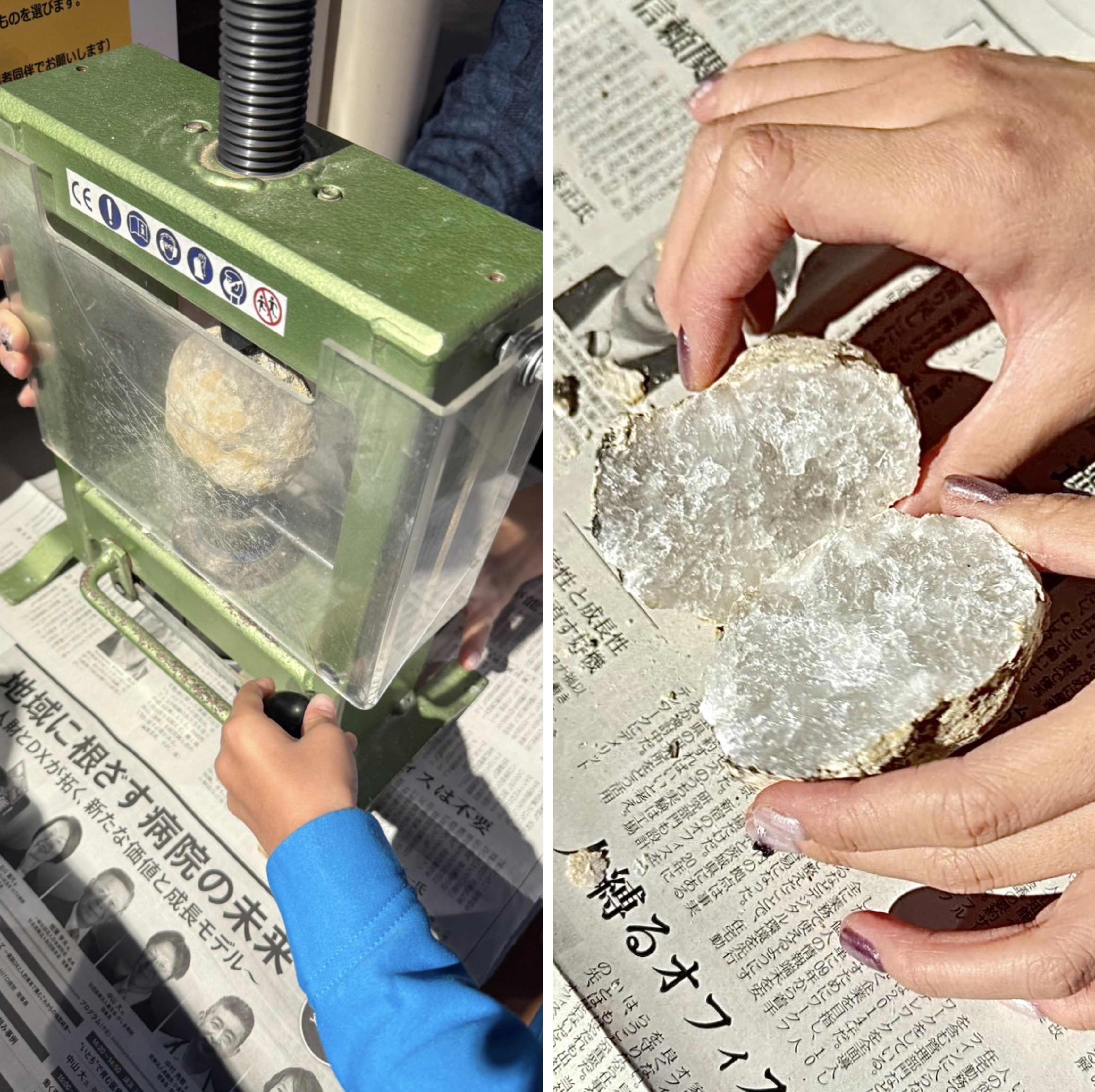 息子に石を選んでもらい、スタッフさんが石を機械に固定してくれます。はじめは息子、次に私、そして夫…みんなで交代でレバーを押してみたのですが、なかなか割れません。最後に私がダメ押しの数回。ついにバチーン!と割れました。