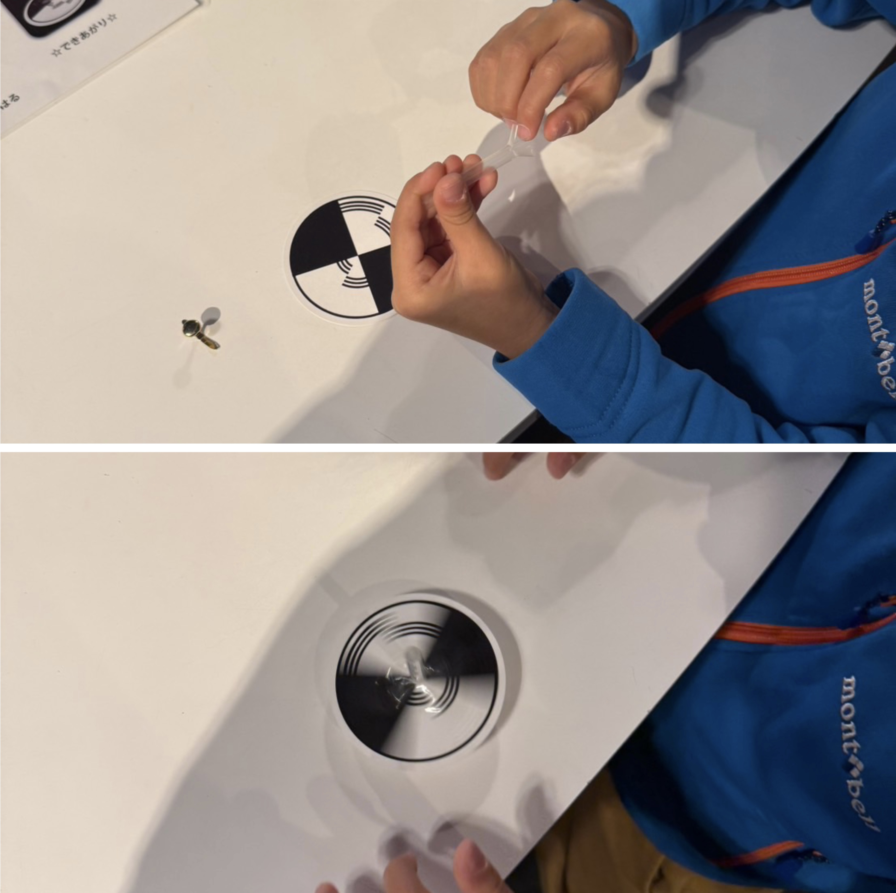 しくみの部屋では、錯覚が不思議なコマを作れるコーナーもあり、スタッフさんに教えてもらいながら作って遊ぶことができます。「ベンハムのコマの原理」。なお、カメラは錯覚しないそう!