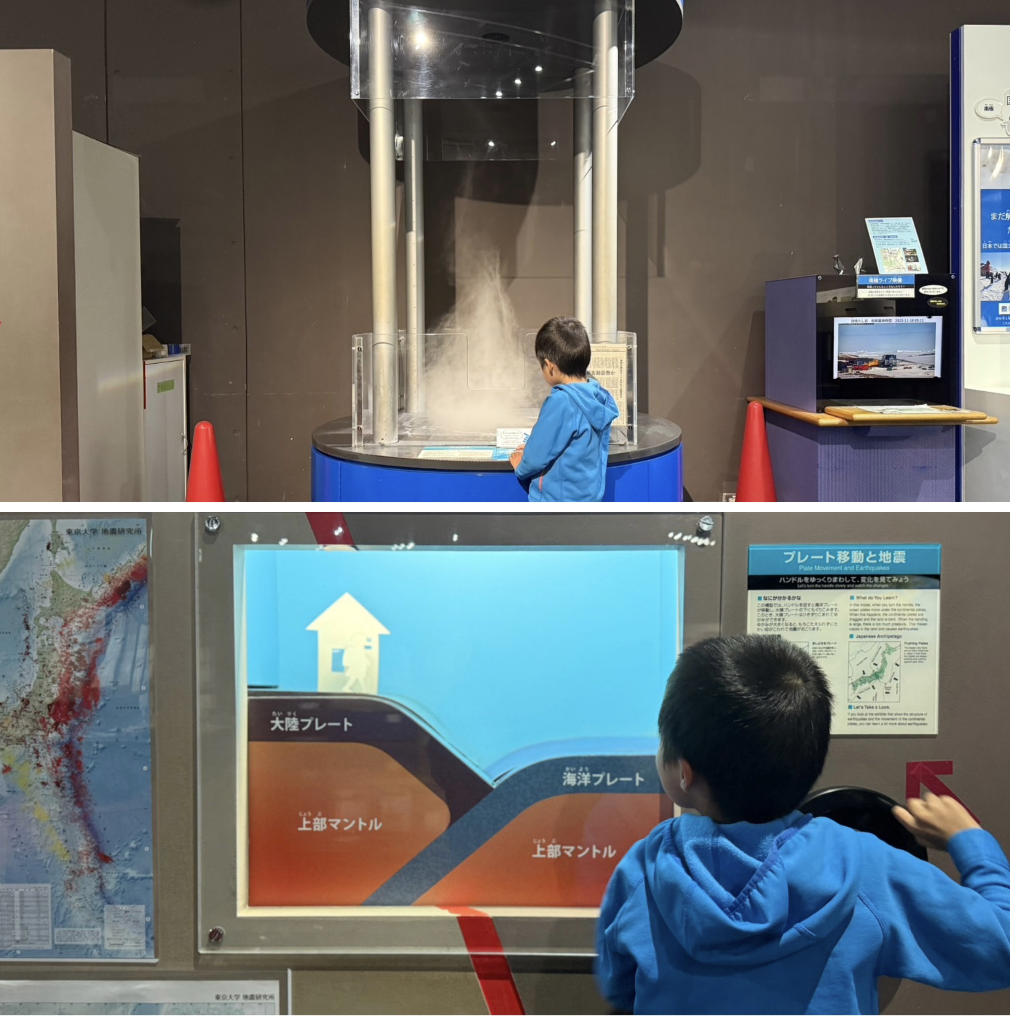 地球の部屋には地震や竜巻のメカニズムがわかる装置があり、息子は何度も確かめていました。これは大人も勉強になります。