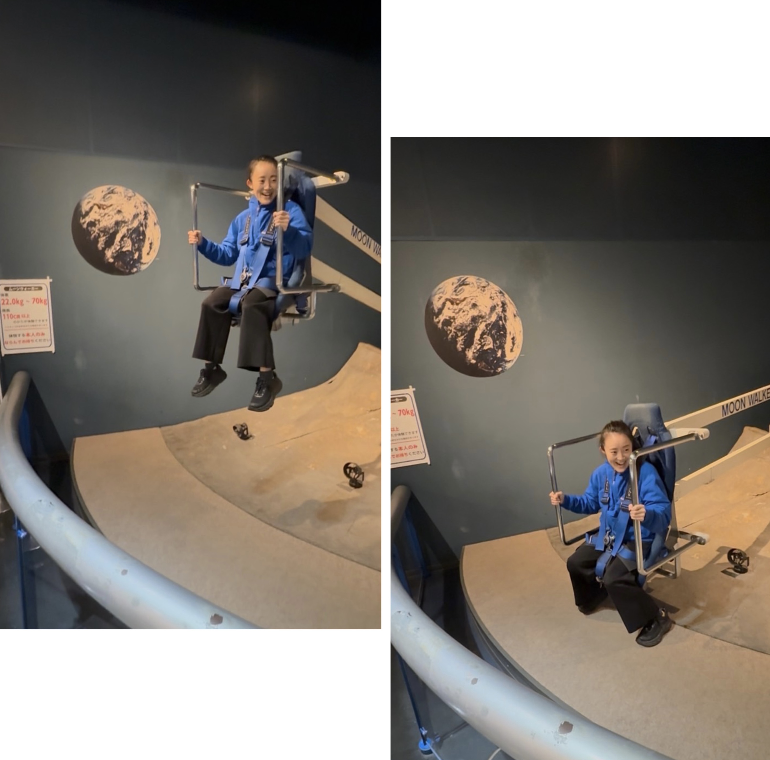 もちろん、家族の代表としてやりましたよ!スタッフさんにシートベルトをしてもらいながら説明を受けます。そして身を任せて2mくらい急浮上!思わず「わあああーーッ!」と大きめの声がでてしまうほど。ゆっくり下に降りてきて足が地面についたらジャンプ!ほんの少し地面を蹴っただけで2m近く上がります。月の重力にはすぐには慣れませんが、私があたふたしている様子に夫と息子はにやにや。なかなかいい時間でした。