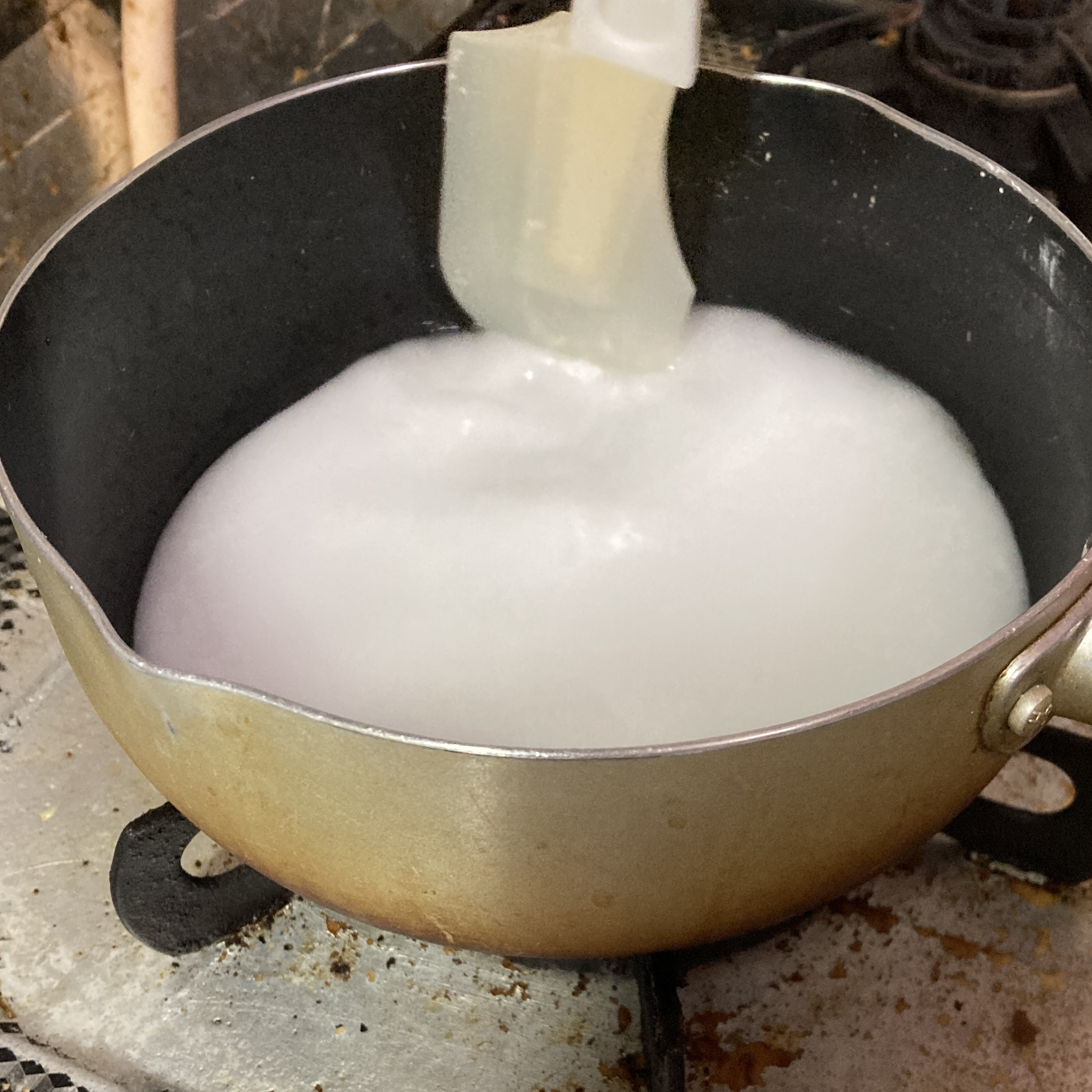2.鍋を中火にかけ、絶えずかき混ぜます。最初はサラサラですが、だんだんモッタリと塊になってきます