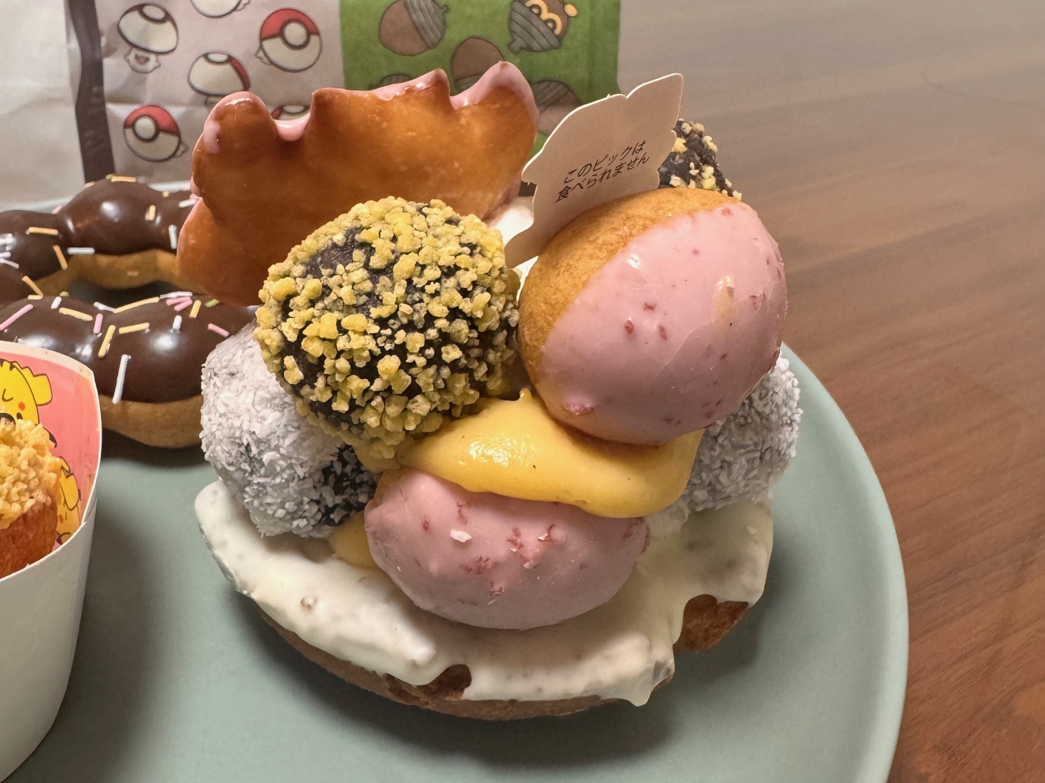 受け取った時に、「とても崩れやすい商品なので持ち運ぶ際はご注意ください」と言われたので慎重に運びました。ドーナツツリーというだけあって、ツリーのように積まれたドーナツポップにメタモンが紛れ込んでいる姿をイメージした商品で、とても可愛かったです。