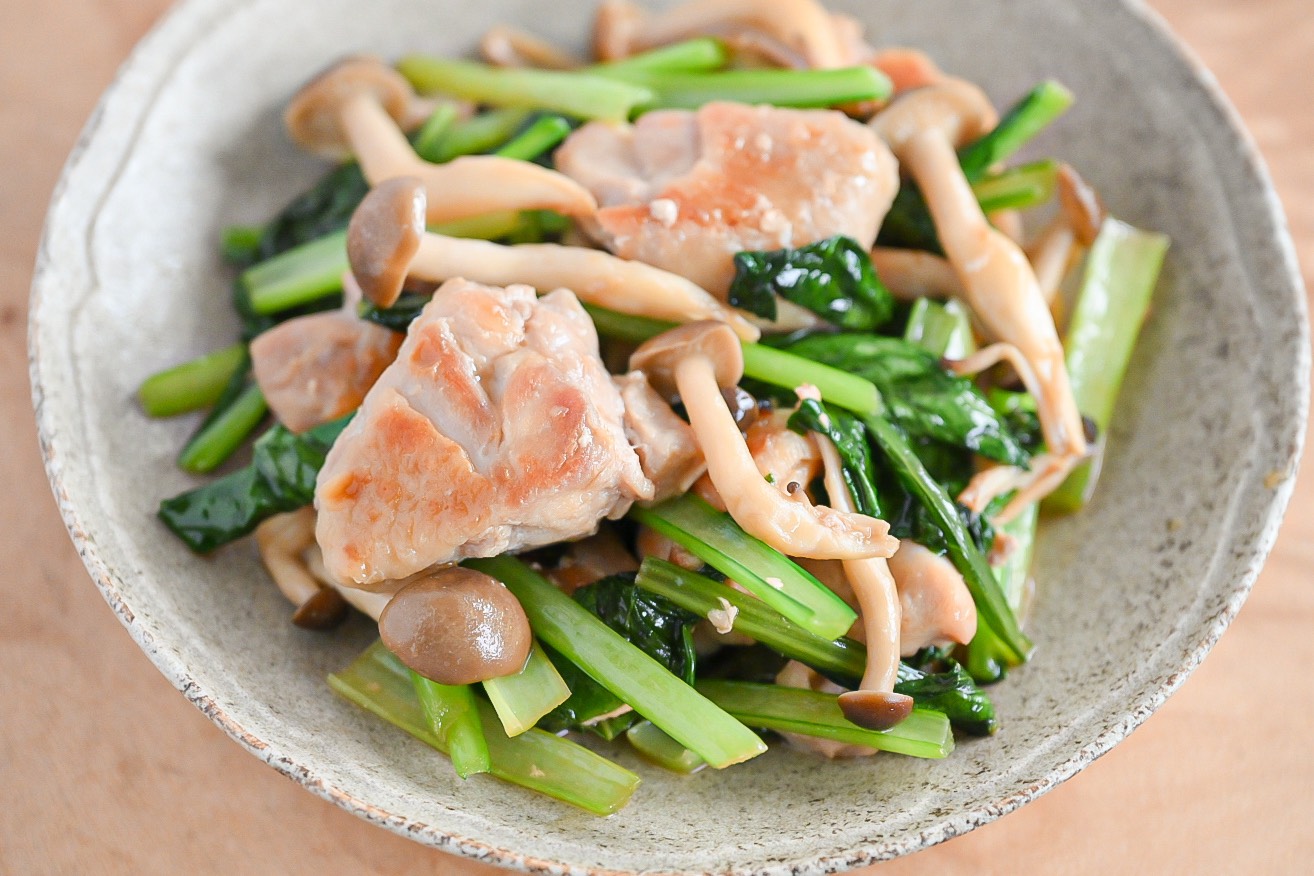 ミツカン公式「鶏肉と小松菜のガーリックバタぽん炒め」